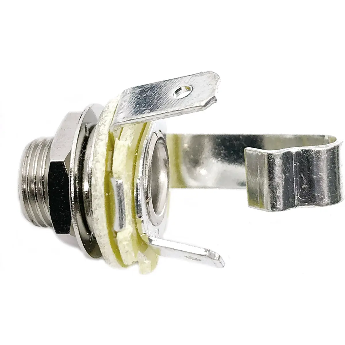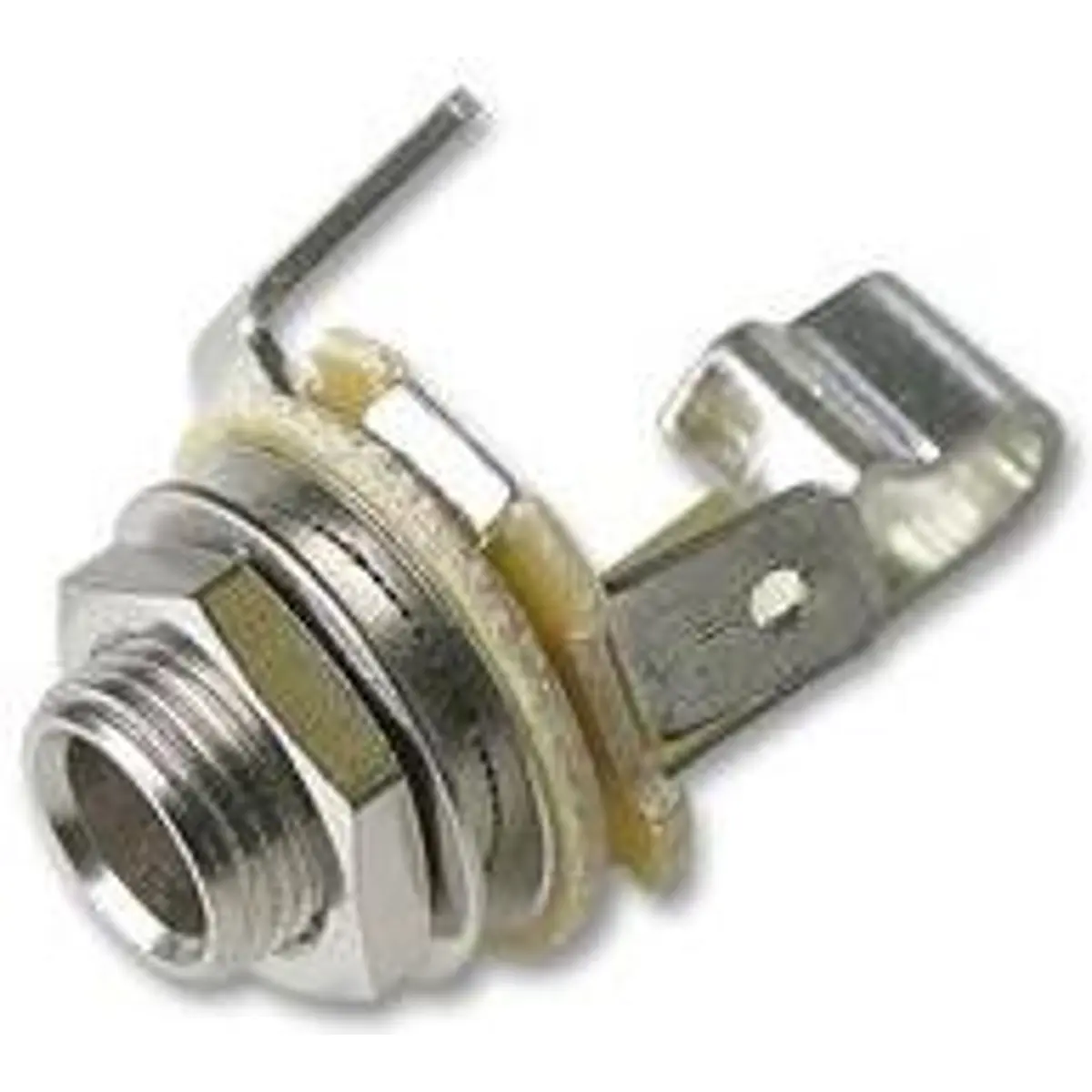 Conector jack fêmea mono para painel, com montagem para painel, diâmetro de furação de 10 mm, rosca 3/8-32, espessura máxima do painel de 3.5 mm e ligação Faston de 0.205 polegadas (5.2 mm). Não possui interruptor.