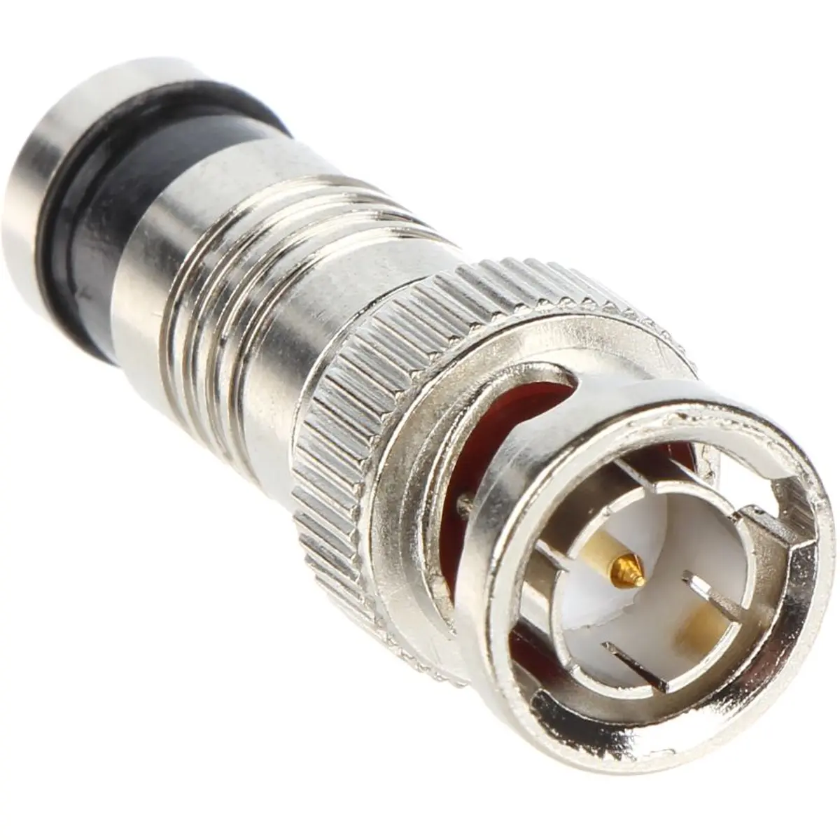 Conector BNC de compressão macho para cabo coaxial RG59, com fixação por compressão (aperto no fio) e estanqueidade na ligação, suportando dieléctrico até 3,7 mm e diâmetro de cabo até 7,3 mm. Oferece resistência à corrosão e muito baixa atenuação em toda a banda de trabalho. A instalação é rápida e simples graças ao cravado correcto do conector, assegurando ligações estáveis para vídeo e telecomunicações.
