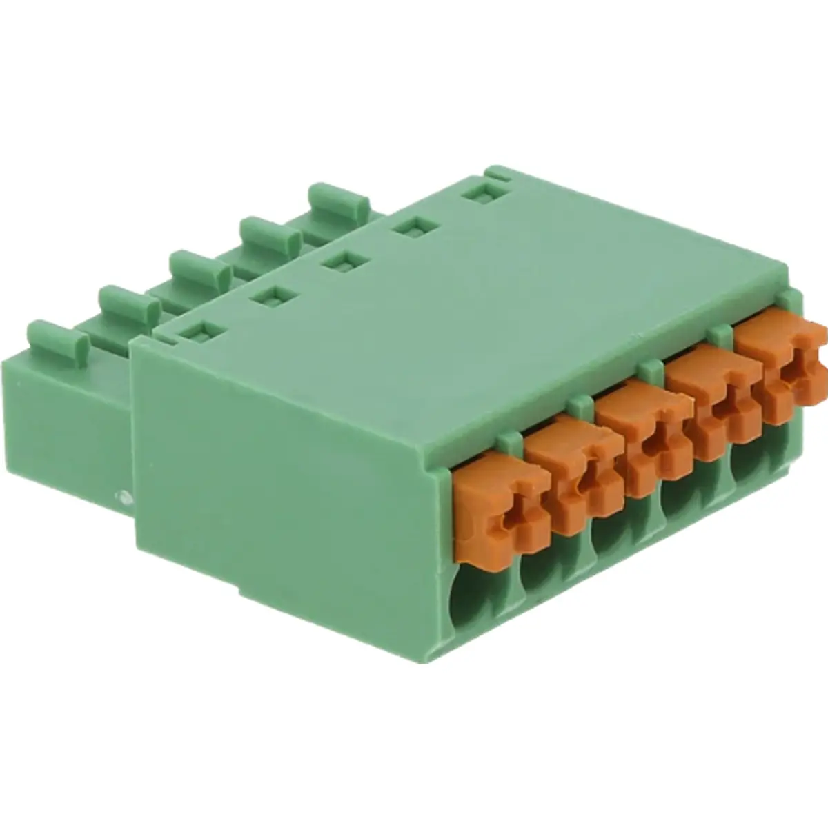 Bloco terminal de encaixe com mola fêmea, com cinco vias e passo de 3,5 mm. Alojamento em PA66 verde, montagem mecânica com cabo e montagem elétrica por aperto de molas. Compatível com cabos 28 AWG a 16 AWG (0,2 a 1 mm2). Tensão nominal de 250 V e corrente de 8 A. Conformidade UL94V-0 e VDE, sistema de bloqueio por pressão, e temperatura de funcionamento entre -40 °C e 105 °C.