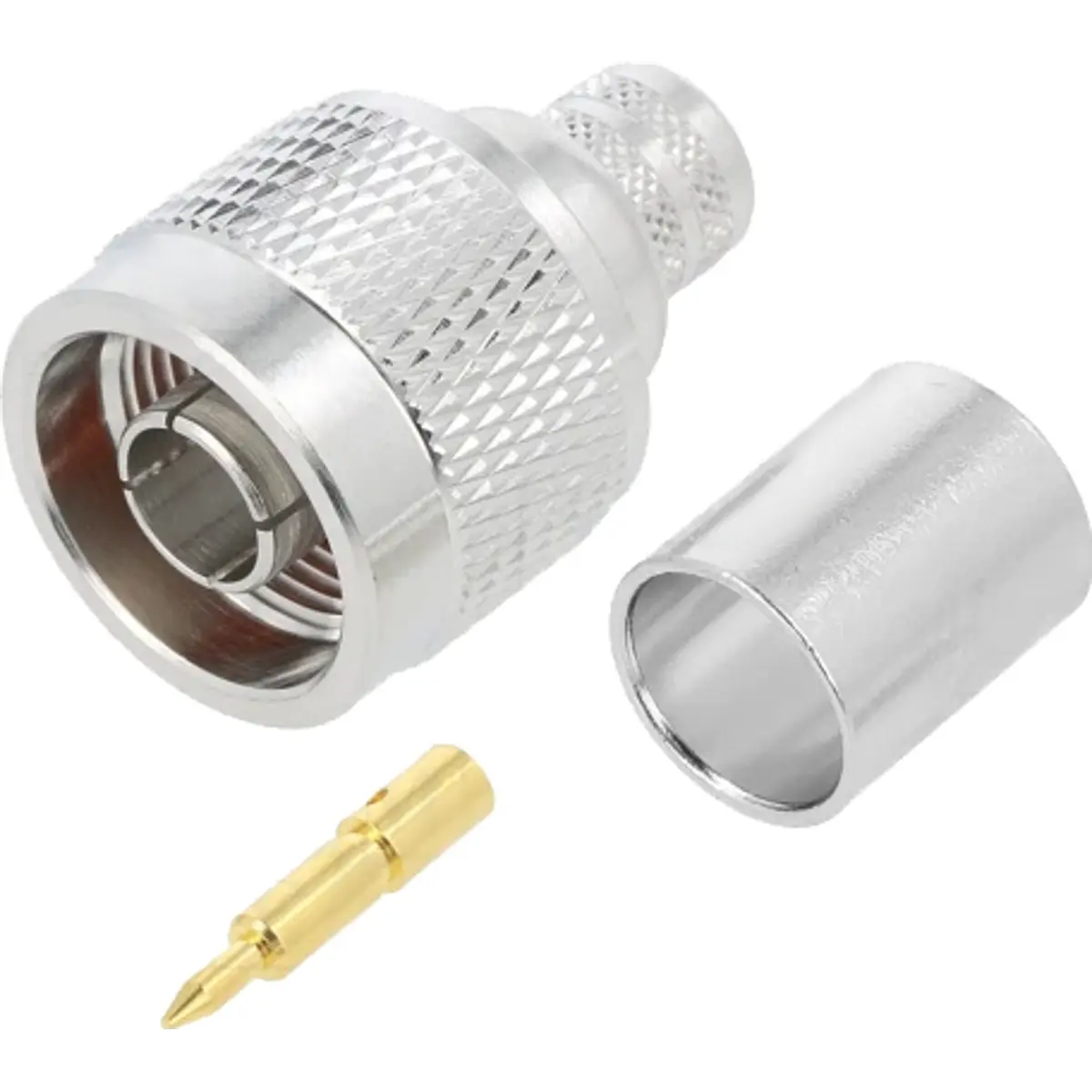 Conector N macho cravável para cabos coaxiais, compatível com LMR400, com isolamento em teflon e impedância de 50 Ω. Projetado para ligações de RF até 11 GHz, oferecendo montagem por crava estável, boa repetibilidade de impedância e baixa perda. Ideal para aplicações de cablagem externa ou interna, com ligação resistente e desempenho estável em ambientes de rádiofrequência.