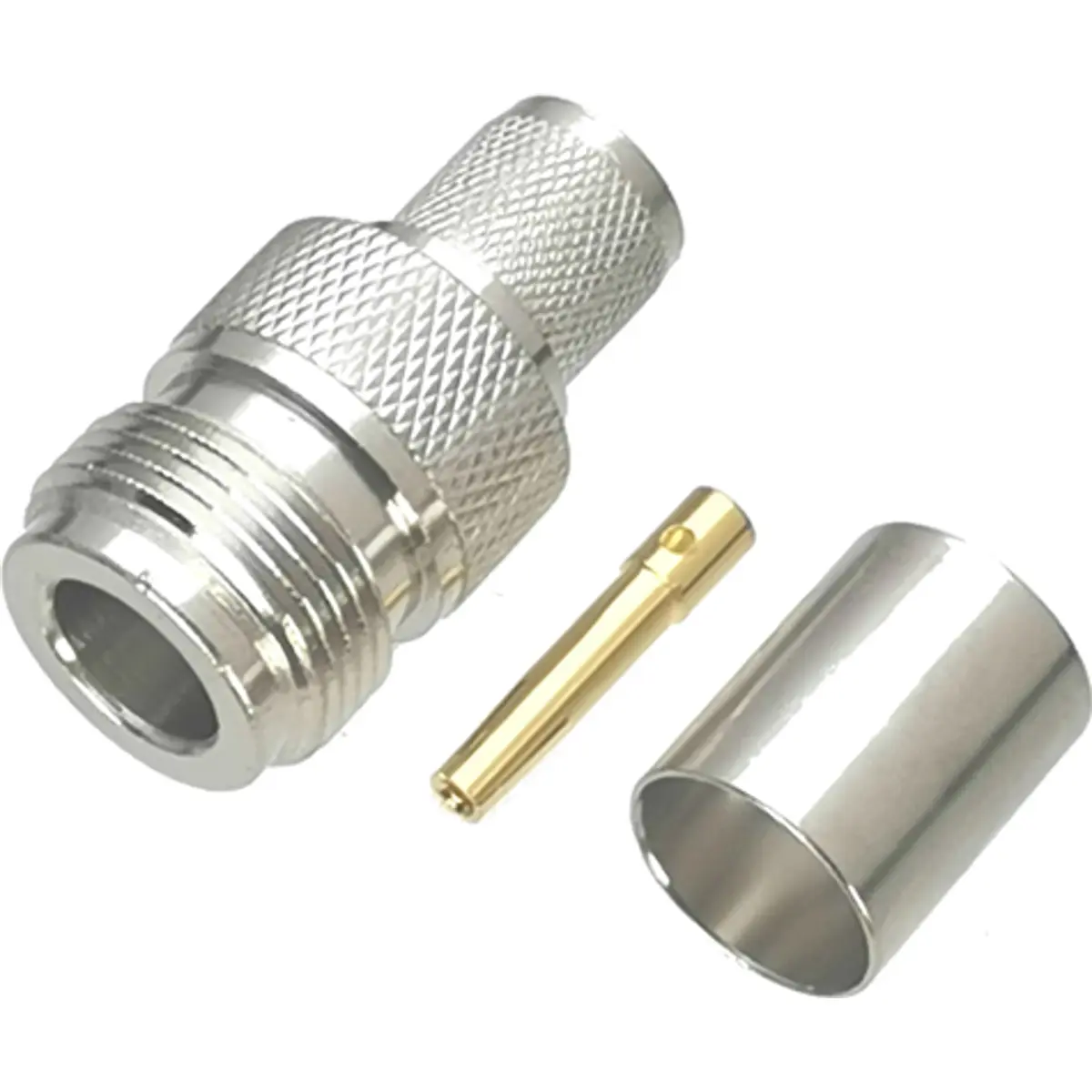 Conector N fêmea de cravar para cabo coaxial LMR400, com impedância de 50 Ω e isolamento em teflon, indicado para frequências até 11GHz. Ideal para ligações RF de alta fiabilidade, montagem cravada em cabos coaxiais, fácil integração em instalações de telecomunicações e sistemas de antenas.