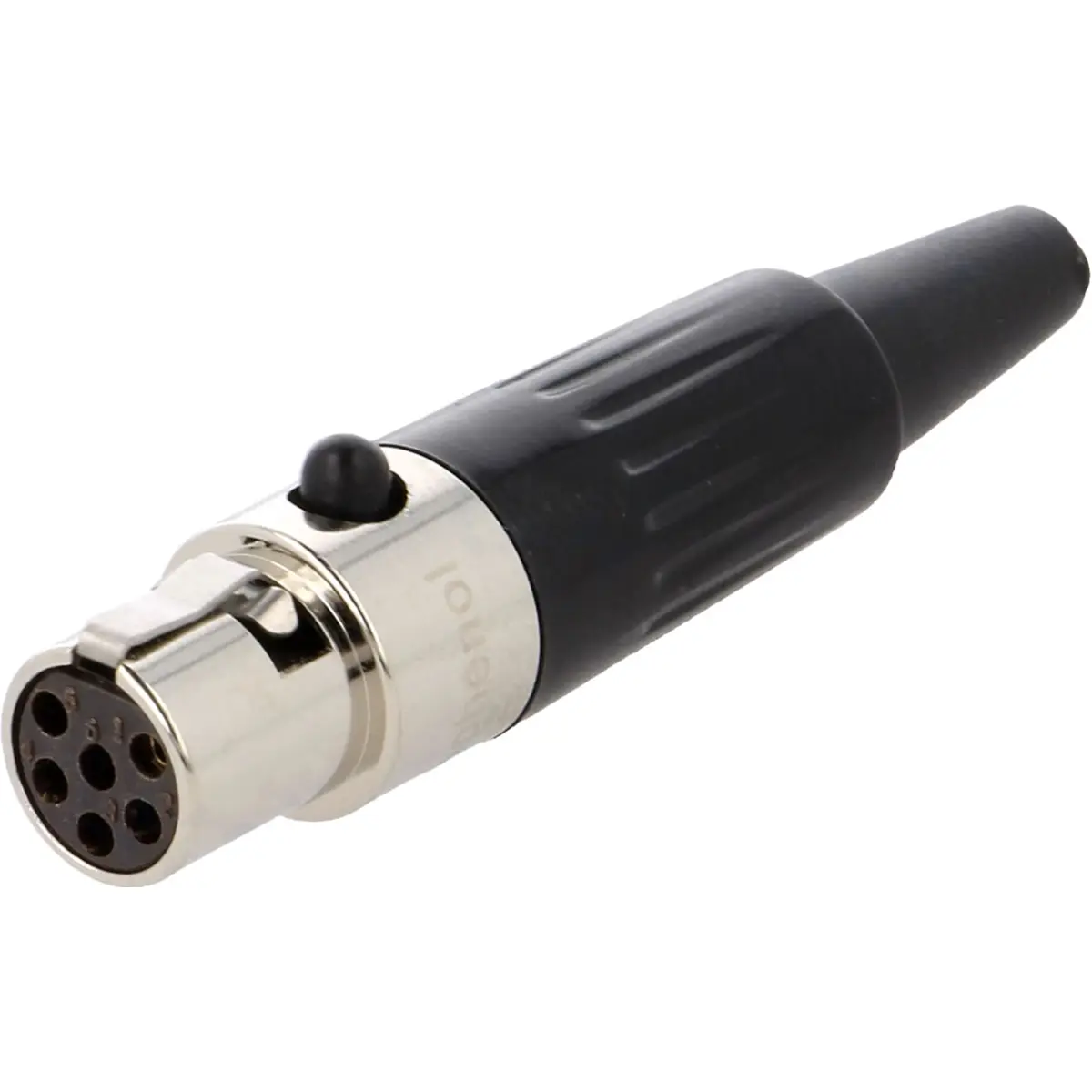 Ficha mini-XLR fêmea de 6 pinos para soldar a cabo, com montagem elétrica por solda e montagem mecânica com cabo. Conector do tipo XLR mini, suportando corrente nominal de 1.2A, diâmetro exterior do cabo de 3.5mm e secção de 0.38mm2. Orientação espacial simples, ideal para cablagem de equipamentos que exijam ligações rápidas e seguras, com aplicações de áudio profissional e instrumentação.