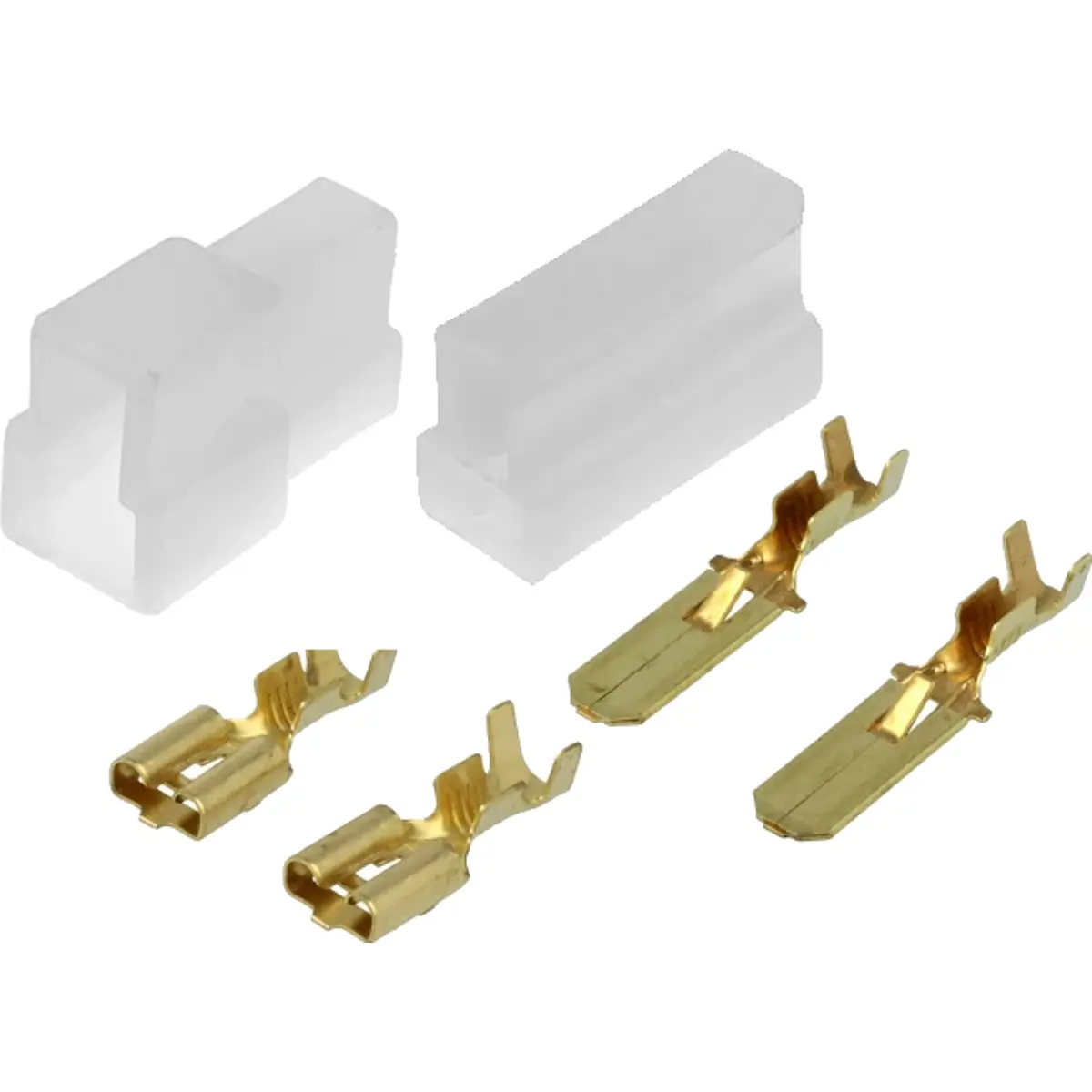 Conjunto de conectores universais de dois terminais, macho e fêmea, dispostos perpendicularmente. O isolamento é em polipropileno. Aceita cabo com secção até 2,5 mm². Possui duas vias e conector plano, com ponta isolada. Inclui terminais. Permite montagem elétrica por cravar e montagem mecânica em cabo, sendo adequado para ligações elétricas seguras e fiáveis em cablagem.