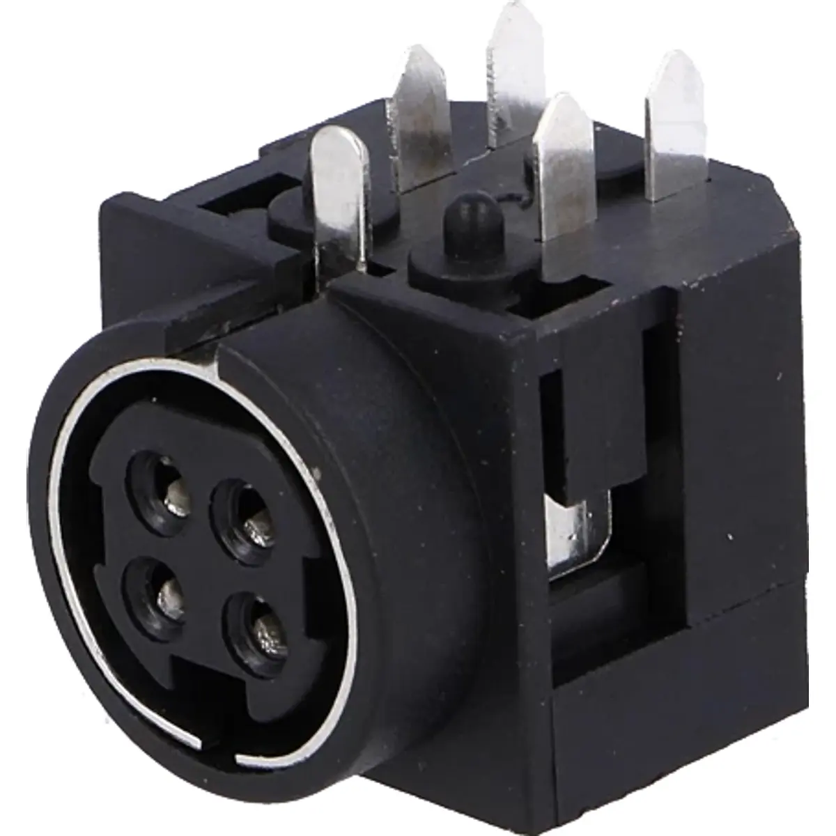 Conector DIN fêmea para painel com 4 pinos, série R7B, indicado para alimentação DC e montagem eléctrica em THT. Suporta uma tensão nominal de 30V DC e uma faixa de temperatura de operação entre -20 °C e 80 °C, tornando-o adequado para aplicações de painel elétrico. Conector de tomada sem referência de marca, adequado a sistemas que requerem montagem em placa ou painel.
