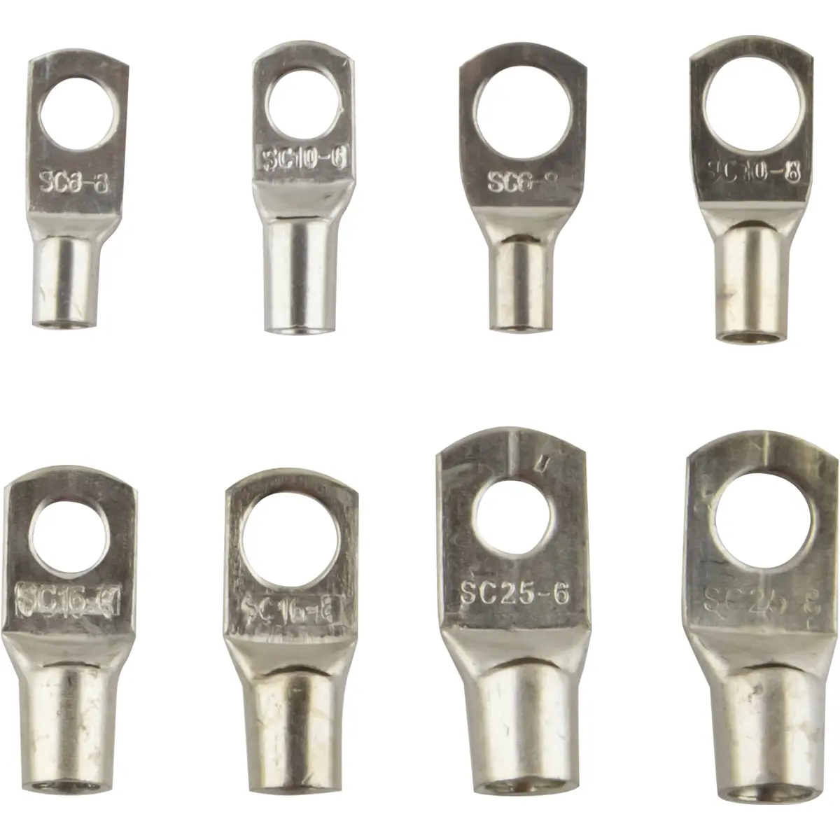 Sortido de terminais de olhal não isolados para cablagem elétrica, compatíveis com fios de 6 a 25 mm², disponíveis com roscas M6 e M8. Este conjunto oferece várias variantes, incluindo 6 mm² (M6, M8), 10 mm² (M6, M8), 16 mm² (M6, M8) e 25 mm² (M6, M8). Perfeito para ligações seguras em painéis e equipamentos, facilita montagem rápida, resistência mecânica e versatilidade em projetos elétricos industriais.