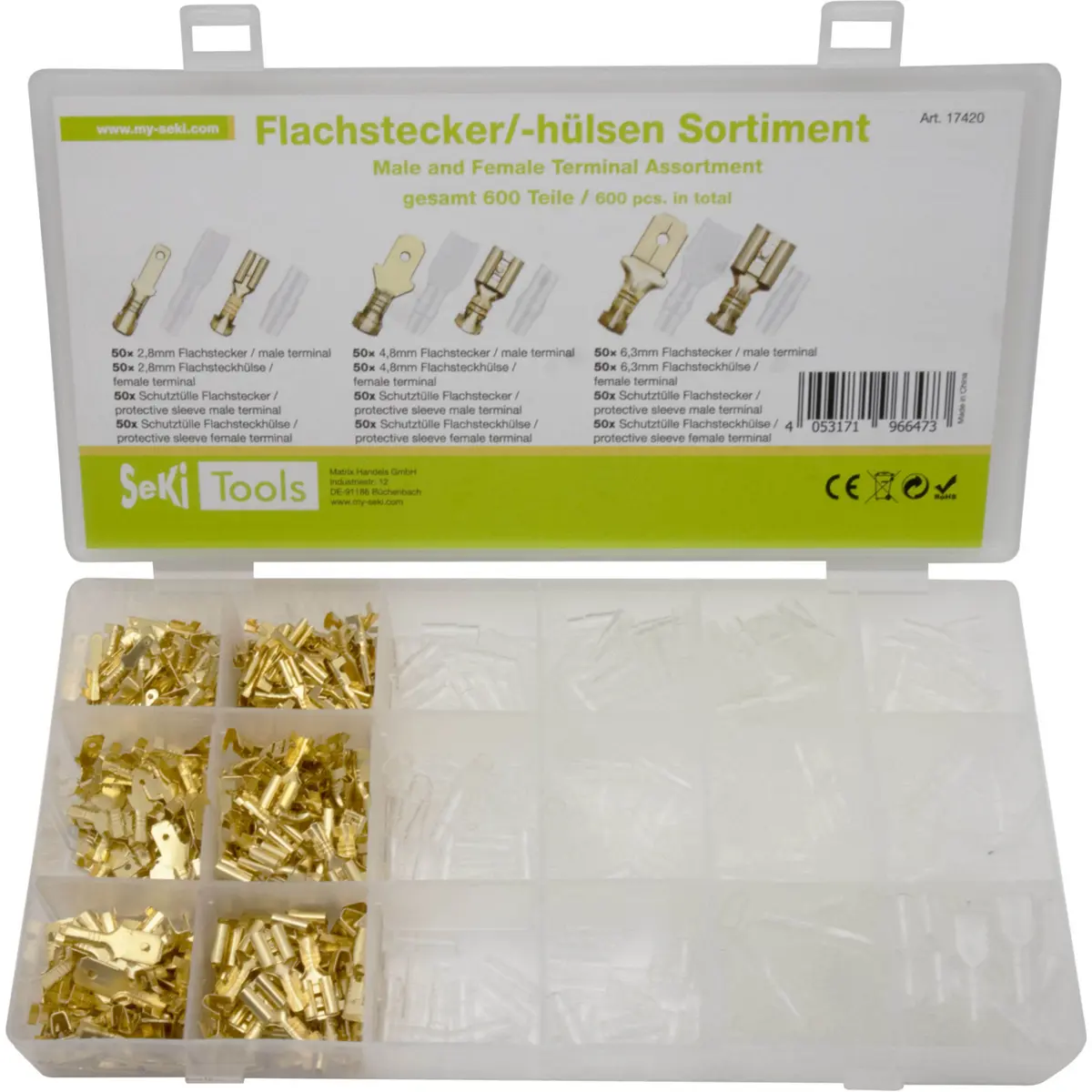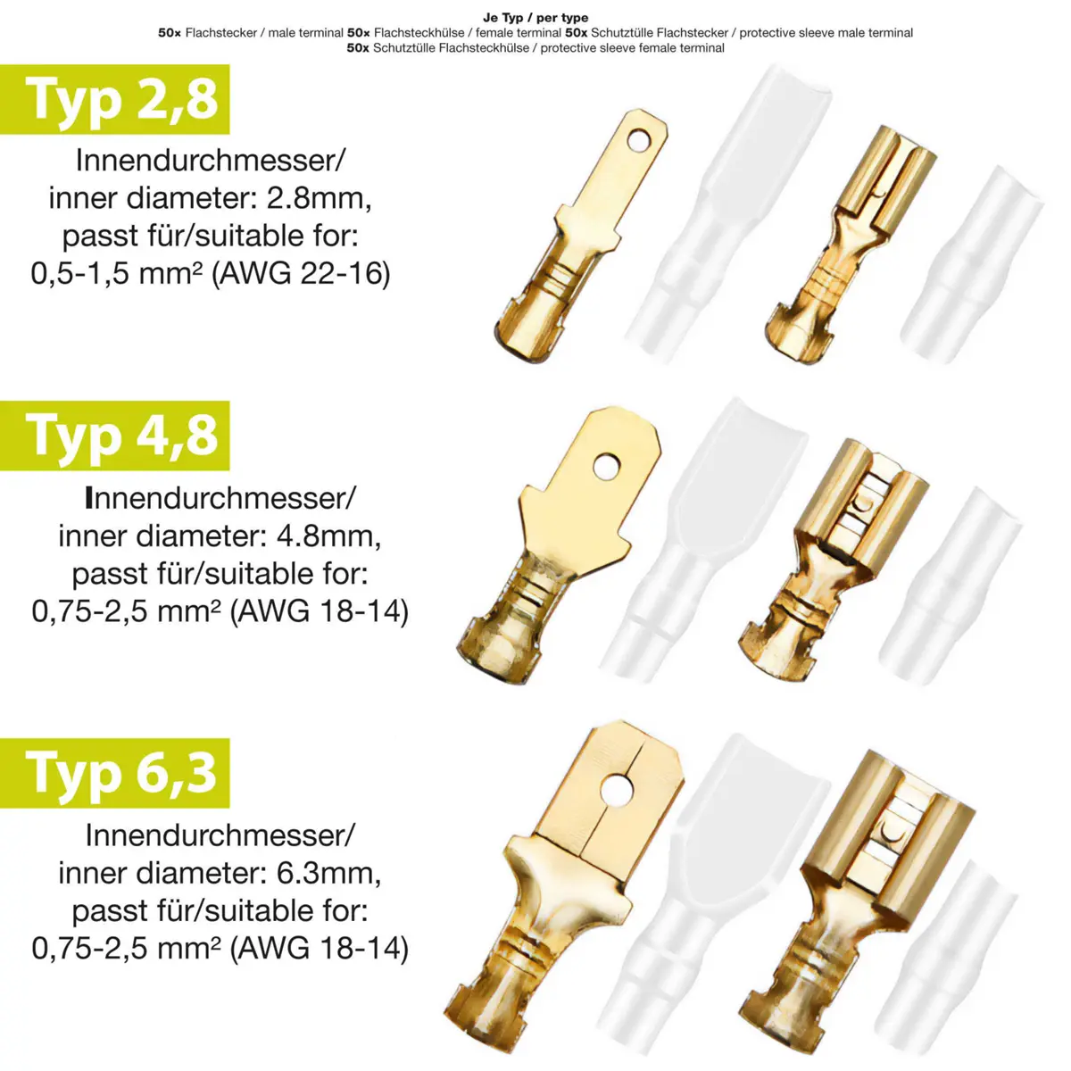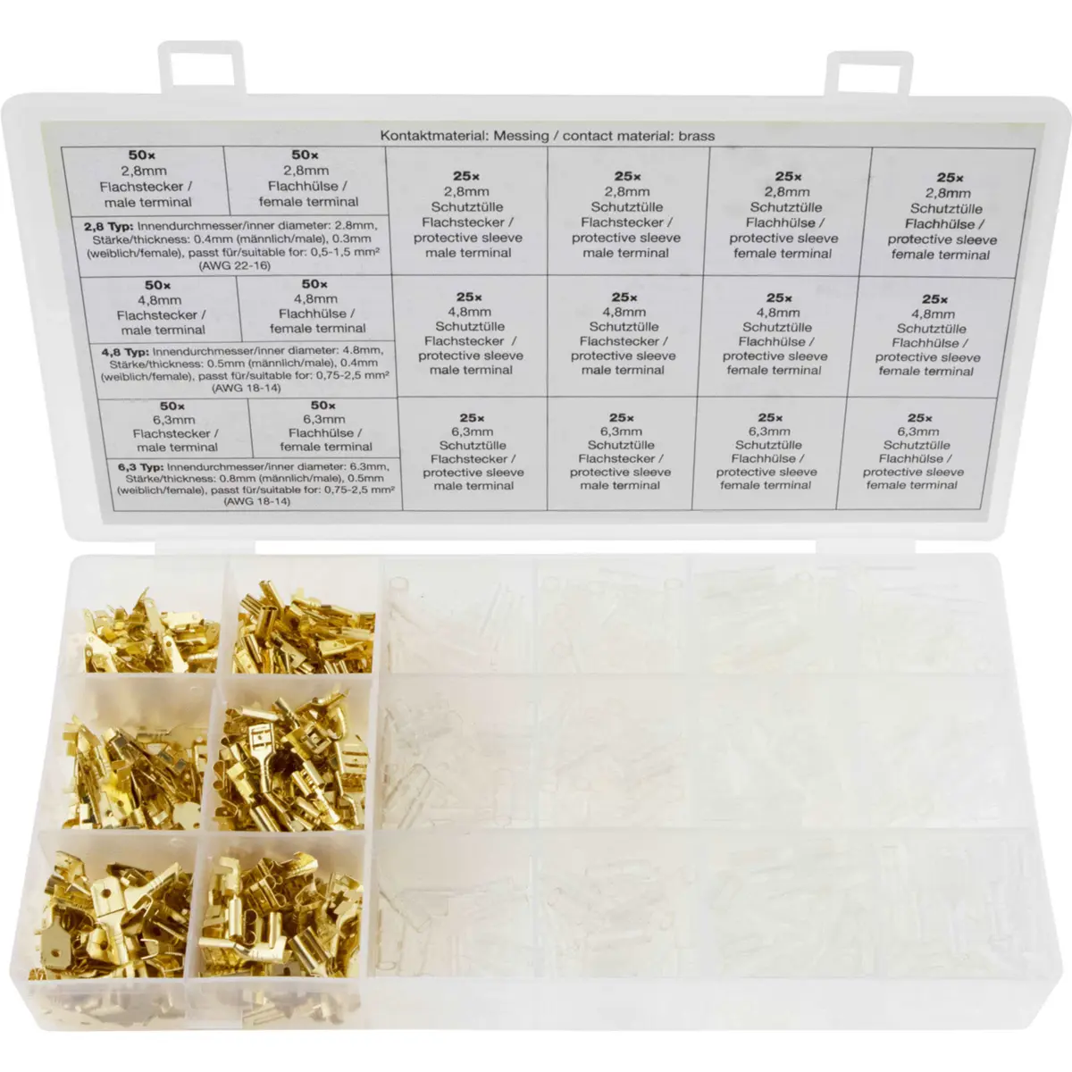 Este kit contém terminais Faston macho e fêmea nas medidas 2.8, 4.8 e 6.3 mm, com capas de isolamento correspondentes. Total de 600 peças, incluindo 50 unidades de cada variante. Permite ligações rápidas e seguras em instalações elétricas, com condutores de 0,5–1,5 mm² (AWG 22–16) para 2.8 mm e 0,75–2,5 mm² (AWG 18–14) para 4.8 e 6.3 mm. Ideal para montagens que exijam isolação prática e organização de terminais.