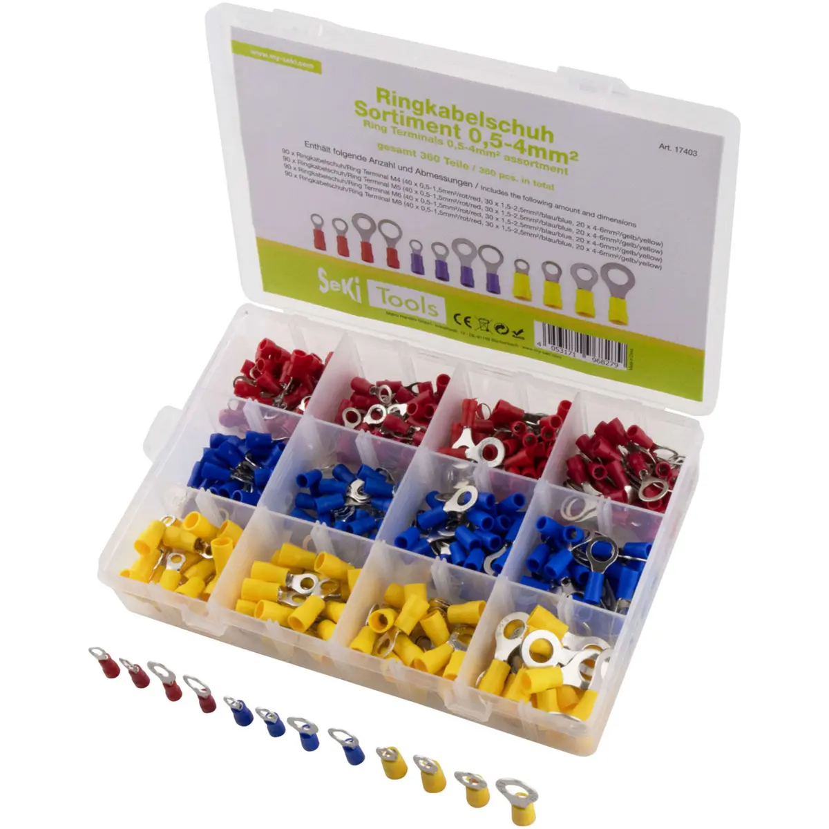 90x Terminal olhal M4 (40x 0,5-1,5mm²/vermelho, 30x 1,5-2,5mm²/azul, 20x 4-6mm²/amarelo)