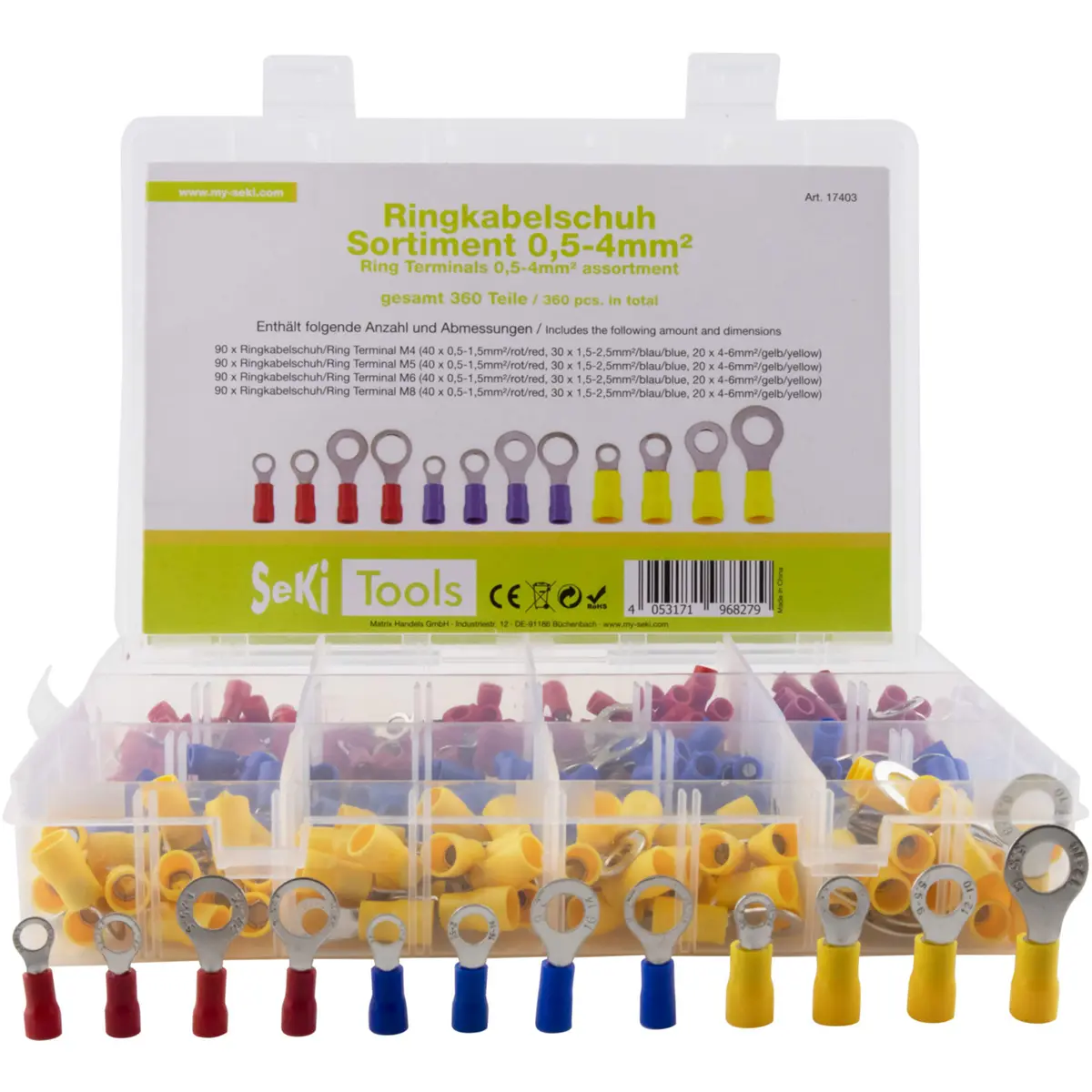 90x Terminal olha M8 (40x 0,5-1,5mm²/vermelho, 30x 1,5-2,5mm²/azul, 20x 4-6mm²/amarelo)