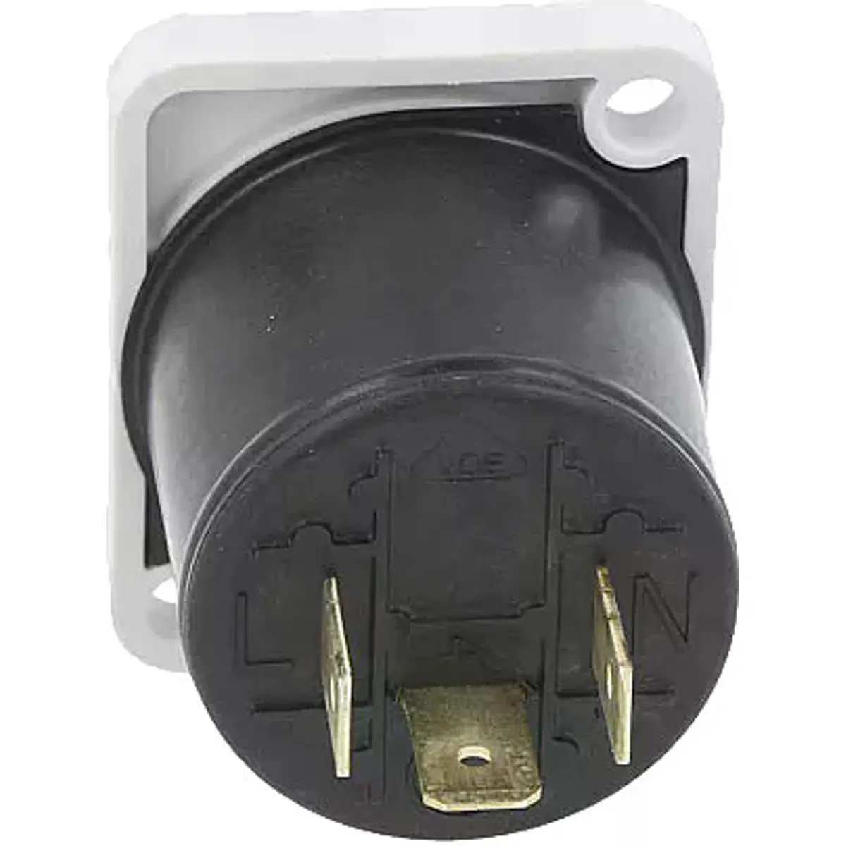 Conector de painel macho para saída de aparelhos, com dois contactos elétricos mais PE, suportando até 20 A a 250 V AC (Europa) e 20 A a 127 V AC, 250 V AC (EUA). Oferece resistência de contacto ≤ 2 mΩ, resistência de isolamento > 10 GΩ e mais de 5000 ciclos de ligação. Cabos de 2,5 mm² (12 AWG) com ligações FASTON 3/16. Contatos de prata, travamento em aço inoxidável e shell em PA 6.6. Classe IP20, faixa de temperatura -30 °C a +80 °C, inflamabilidade UL 94 V-0. Ideal para montagem em painel com fiabilidade.