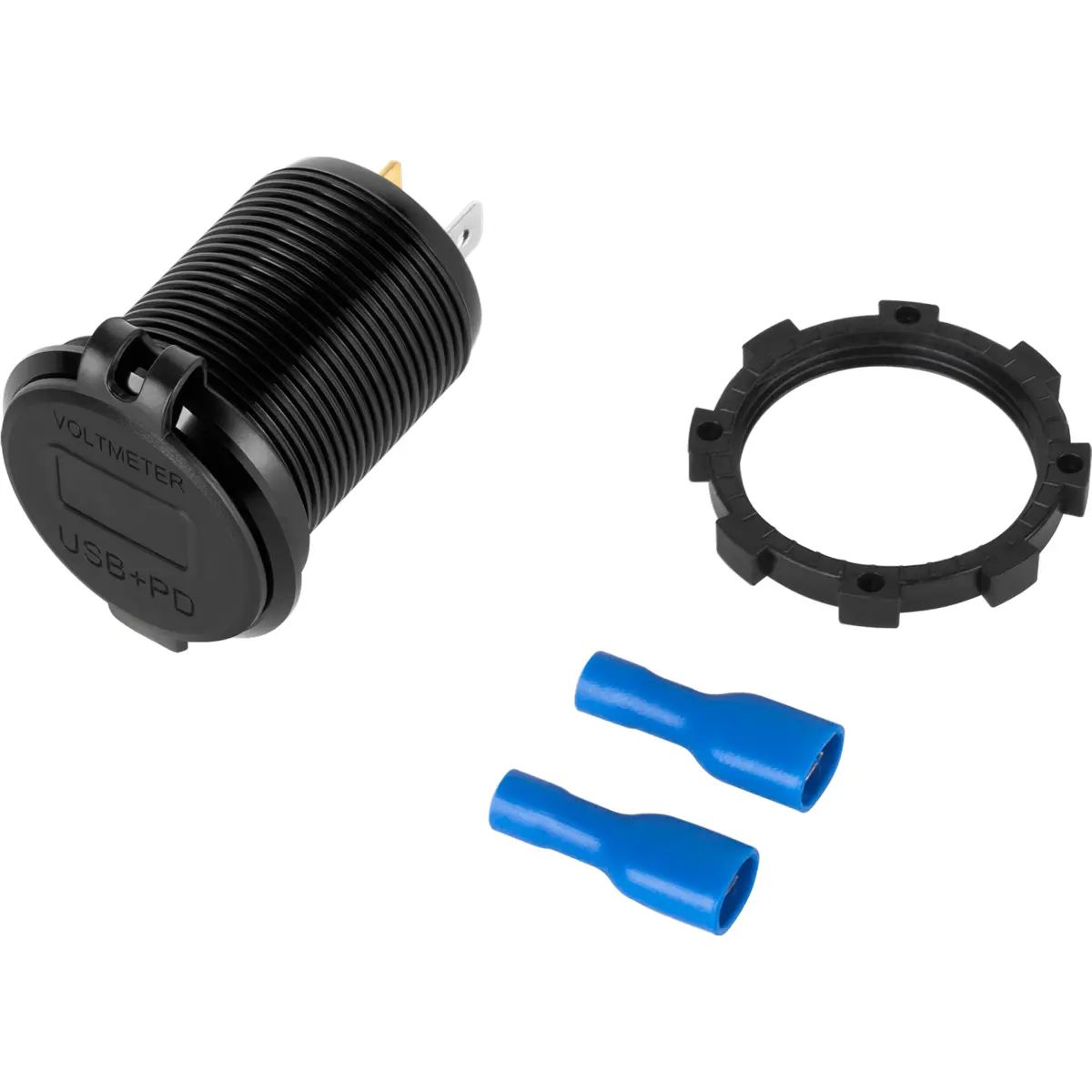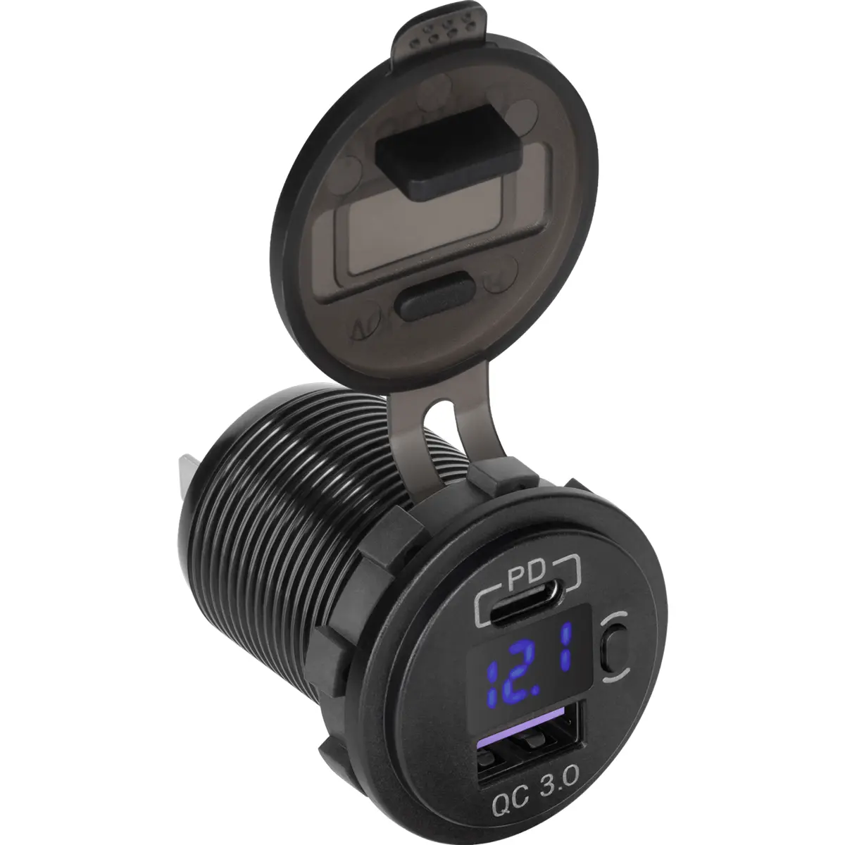 Tomada de painel com USB-C PD e USB-A QC3.0, até 48W, indicador de tensão e entrada 12-24V. Oferece saída USB de 5/9/12V com 3A/2A/1,5A e saída PD de 5/9/12/15V com 3A/2A/2,5A/1,5A; furo de montagem de 29 mm. Ideal para automóveis e instalações industriais, assegura carregamento rápido com compatibilidade QC3.0 e PD, e monitorização da tensão para maior segurança.