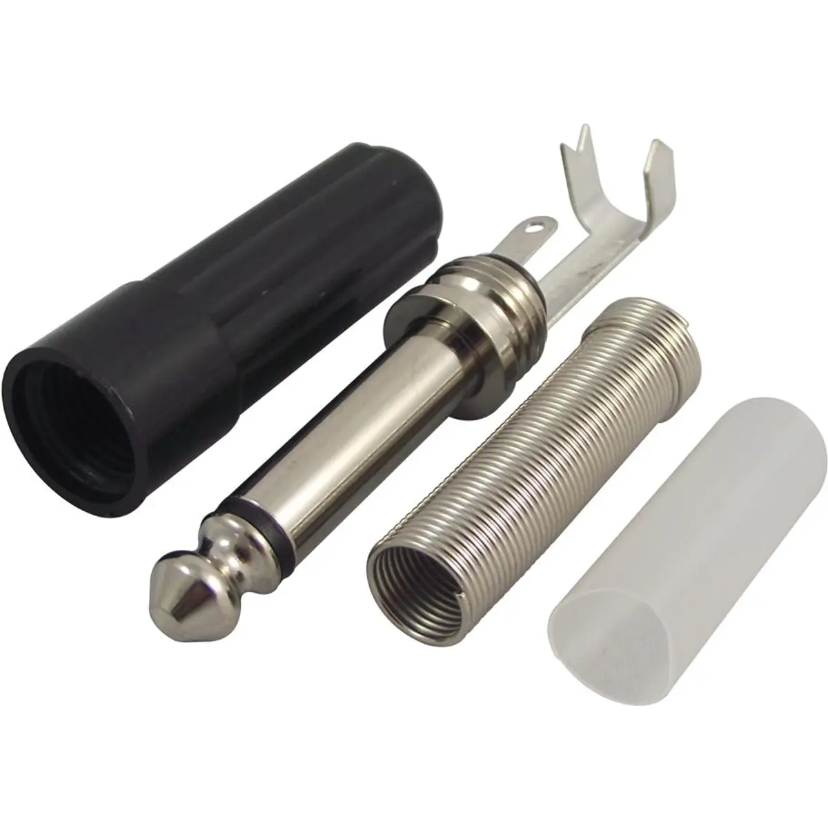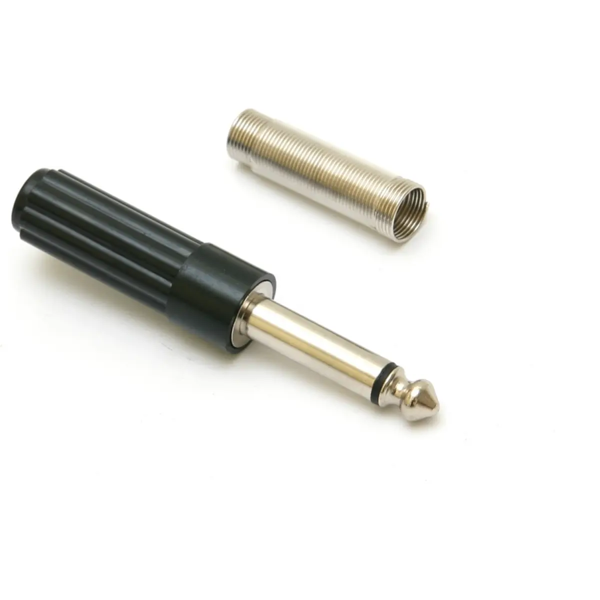 Ficha Jack 6.35mm, Macho, Mono, com corpo de plástico e proteção de cabo do tipo mola.