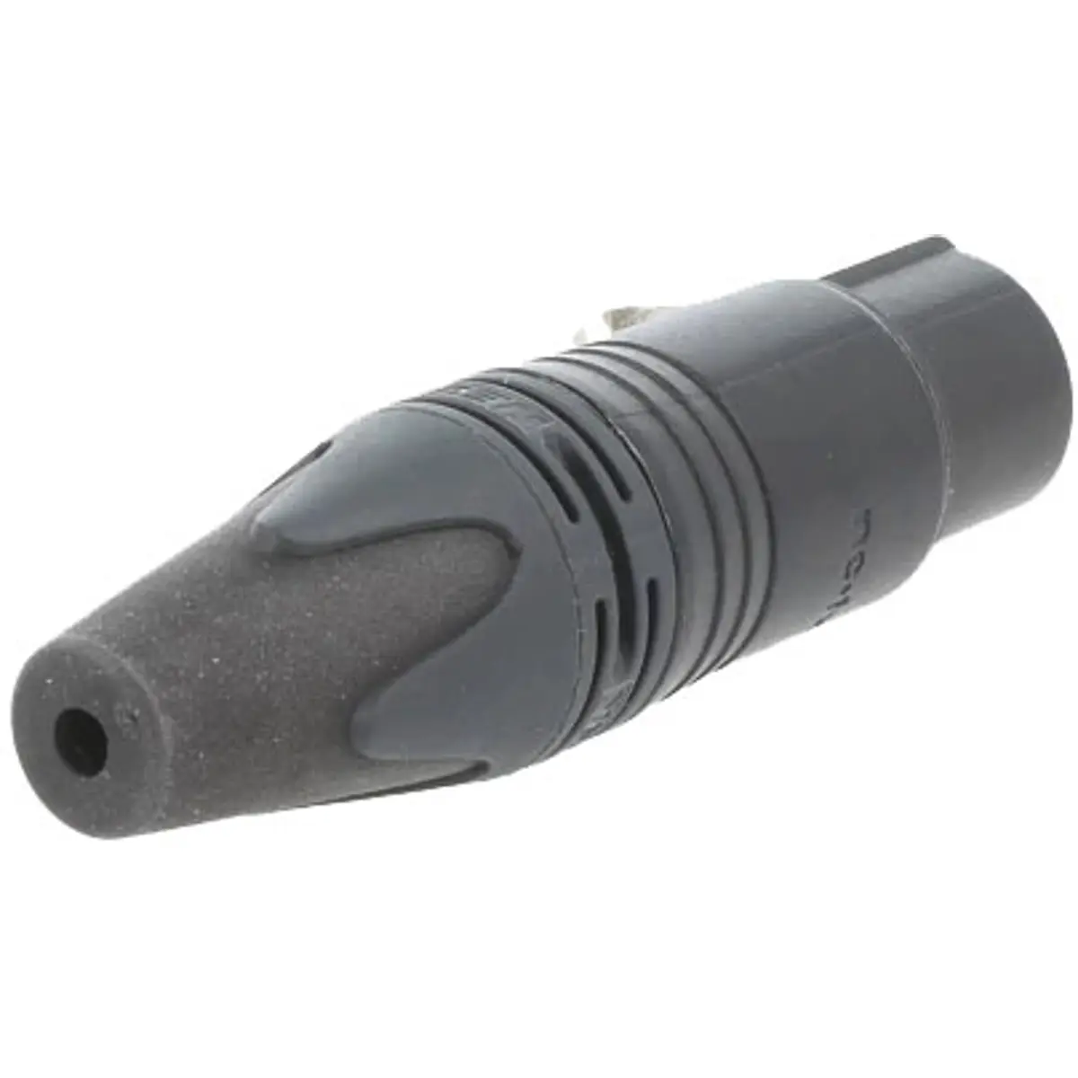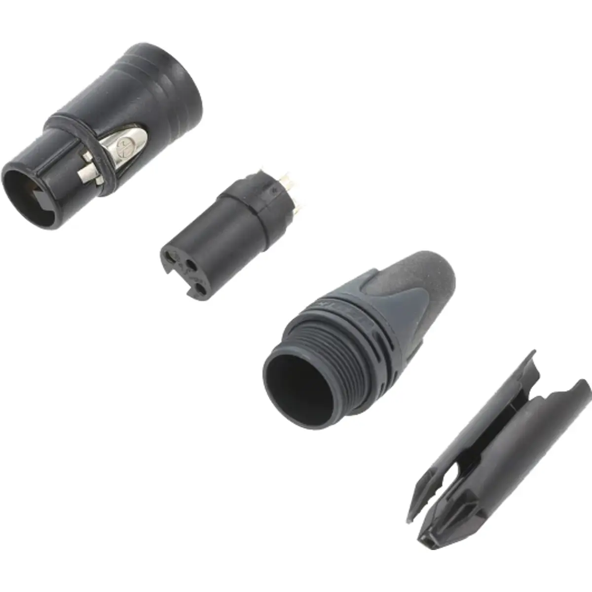 Ficha XLR fêmea de 3 pólos com caixa metálica preta e contactos prateados.