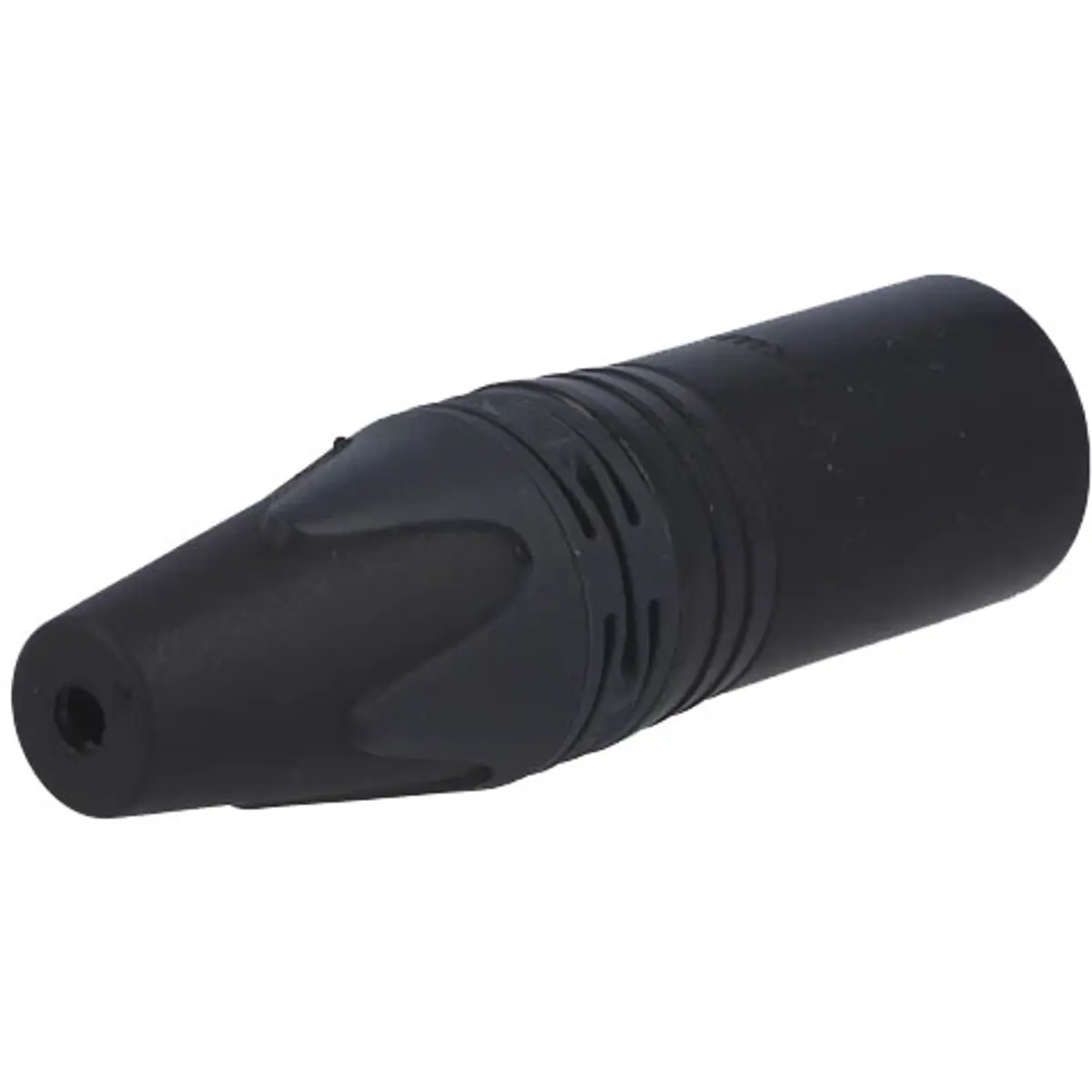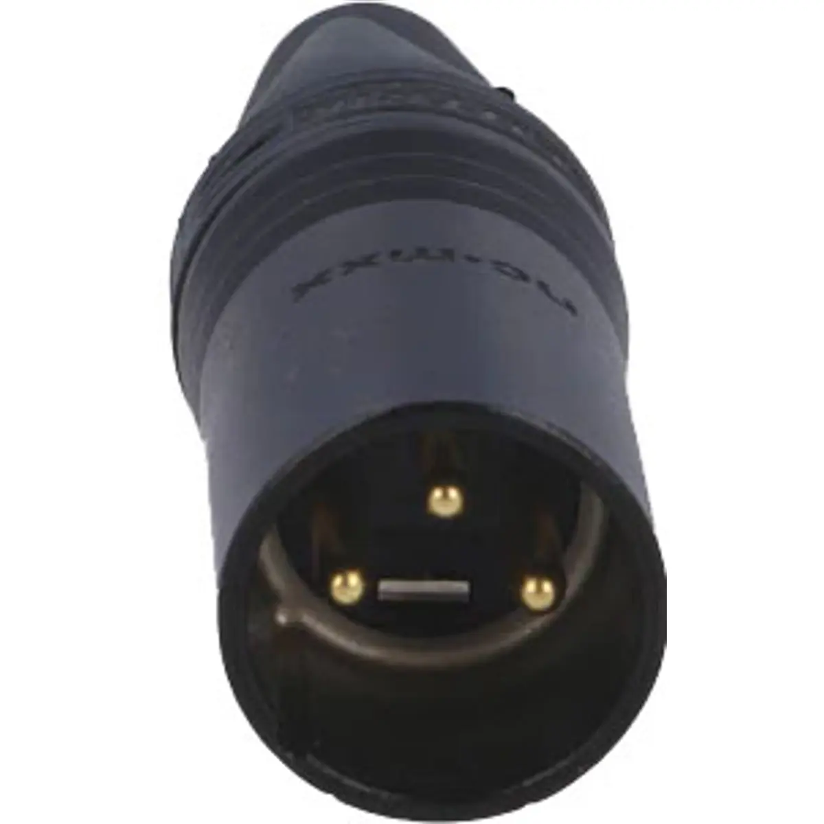 Ficha XLR macho de 3 pólos com estrutura metálica preta e contactos dourados.