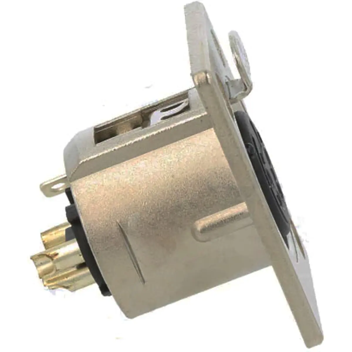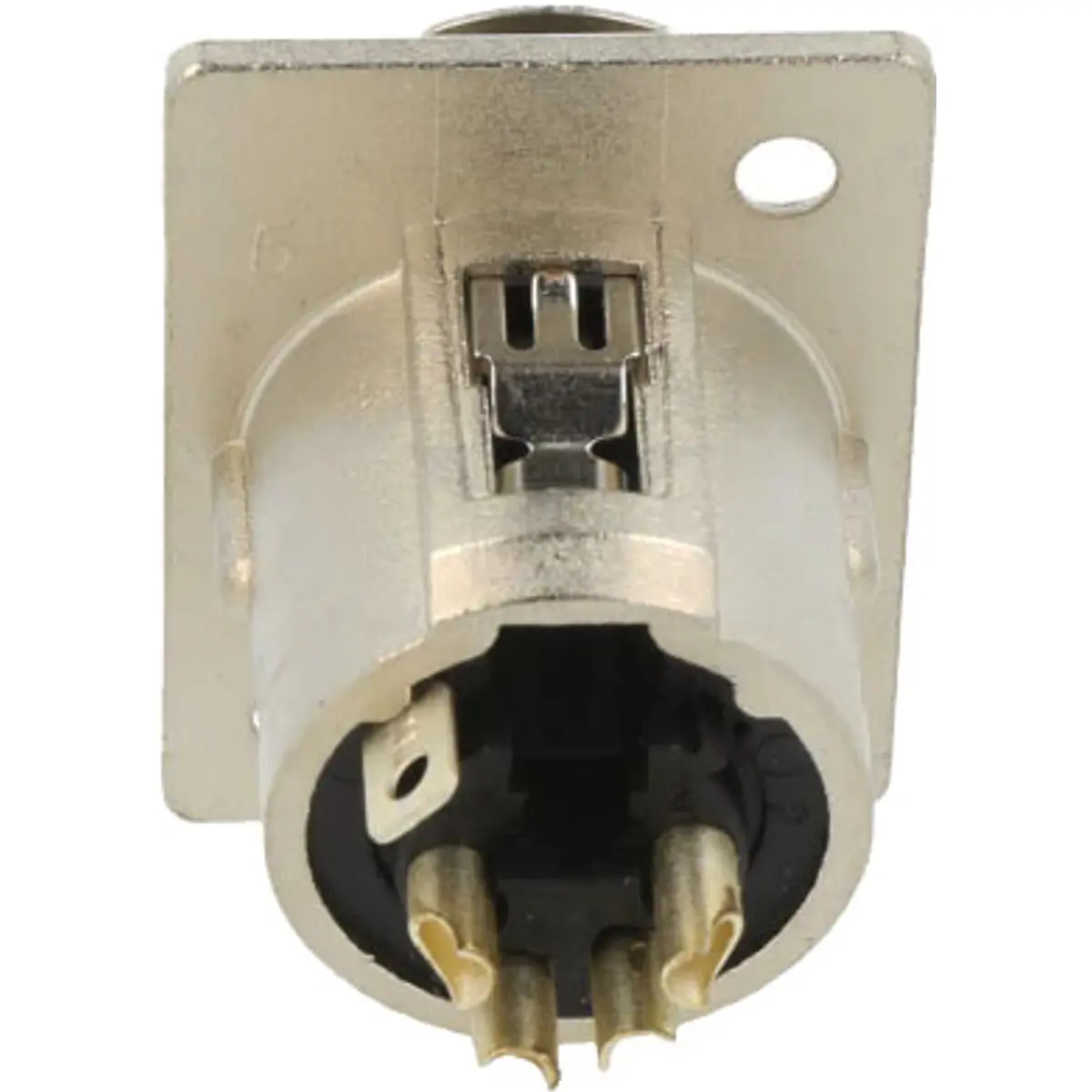 Recetáculo XLR, fêmea de 4 polos, de montagem em painel, metálico de estilo tradicional, de tamanho reduzido, com grandes contactos de solda para facilitar a cablagem.