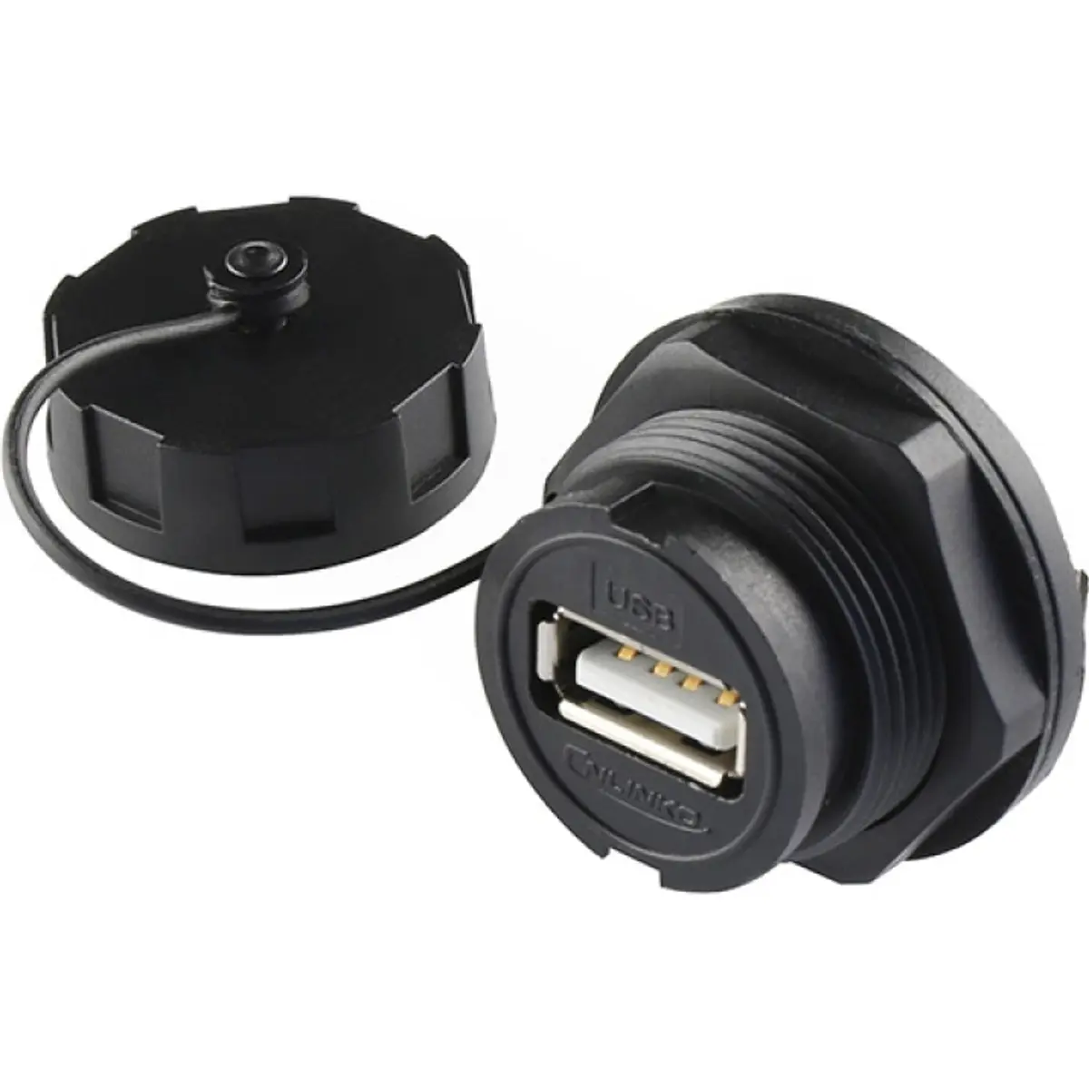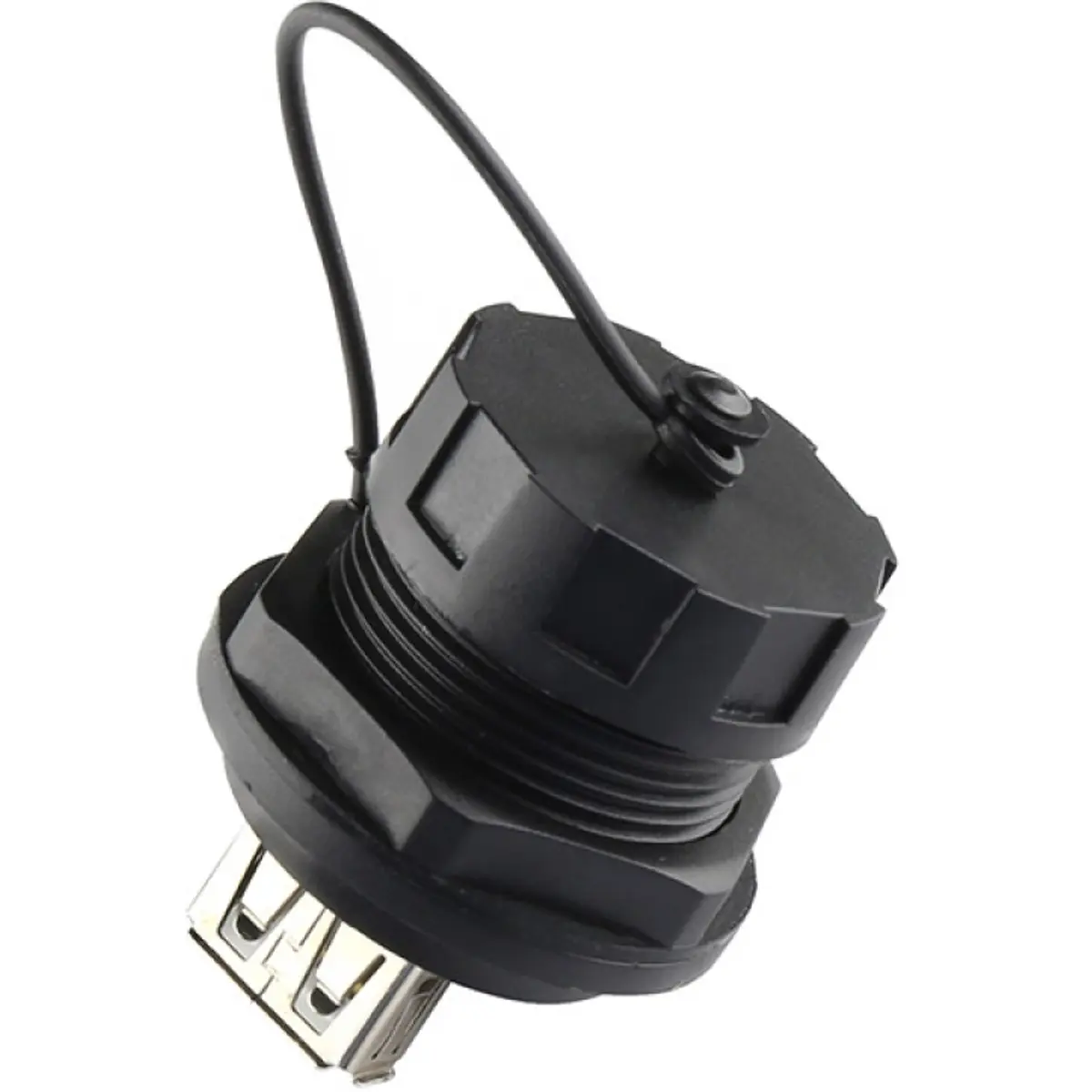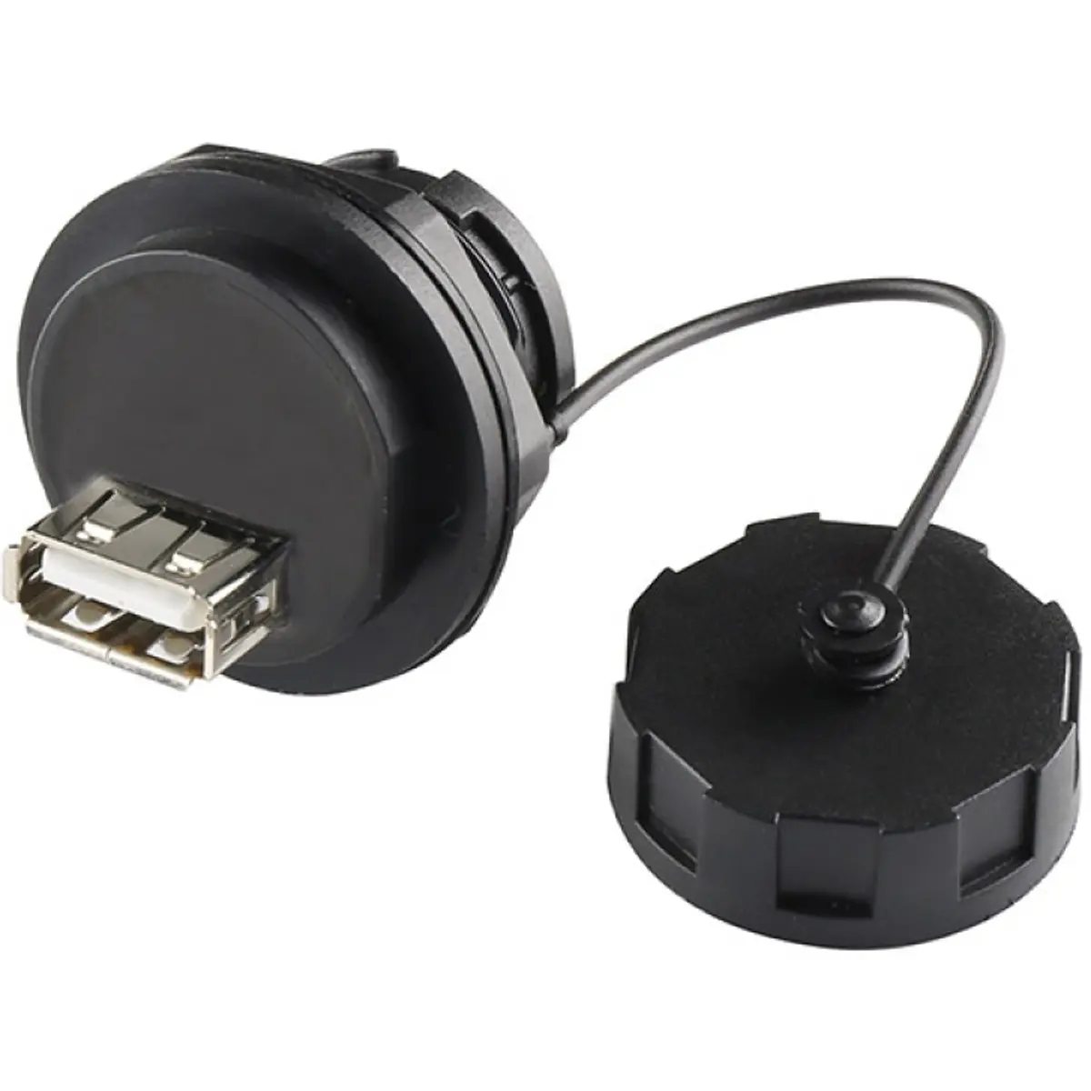 Este conector do tipo USB-A está alojado num conjunto de plástico moldado com O-rings e juntas de painel para manter a sua ligação USB de montagem em painel não só à prova de pó, mas também à prova de água. A parte frontal do conjunto é roscada para aceitar um cabo impermeável ou uma tampa de vedação que mantém a vedação à prova de água quando não há nada ligado.