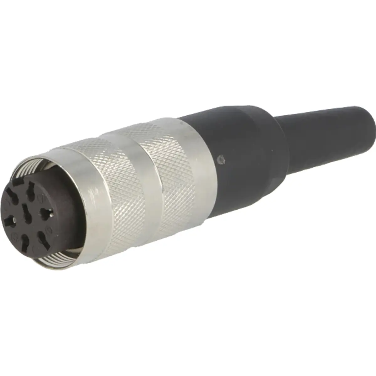 Conector de ficha M16 de 7 pinos, fêmea, com proteção IP40, para cabos de 4-6 mm de diâmetro e 0,5 mm². Montagem eléctrica por solda e mecânica com cabo, adequada para ligações seguras em equipamentos, com rosca interna de bloqueio, série C091A, com orientação simples e tensão nominal de 250V e corrente até 5A.