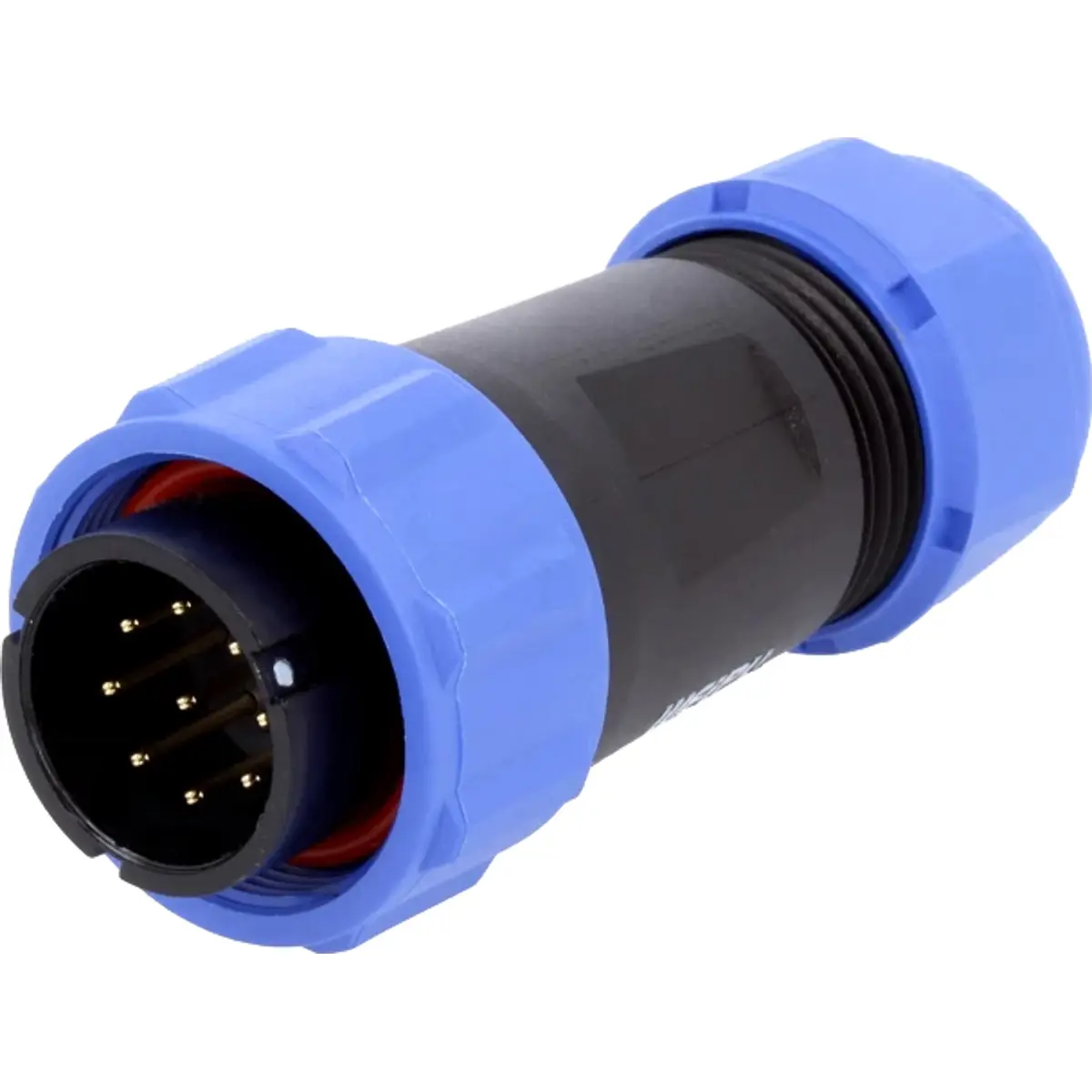 Conector SP21 macho para cabos com solda, ficha redonda com proteção IP68 e 9 pinos. Montagem elétrica por solda, montagem mecânica com cabo. Suporta 500V e 5A, diâmetro de cabo 7-12 mm, fio 0,75 mm², temperatura de operação entre -40 °C e 85 °C, com rosca interna de bloqueio. Ideal para ligações seguras e duráveis em aplicações industriais e exteriores.