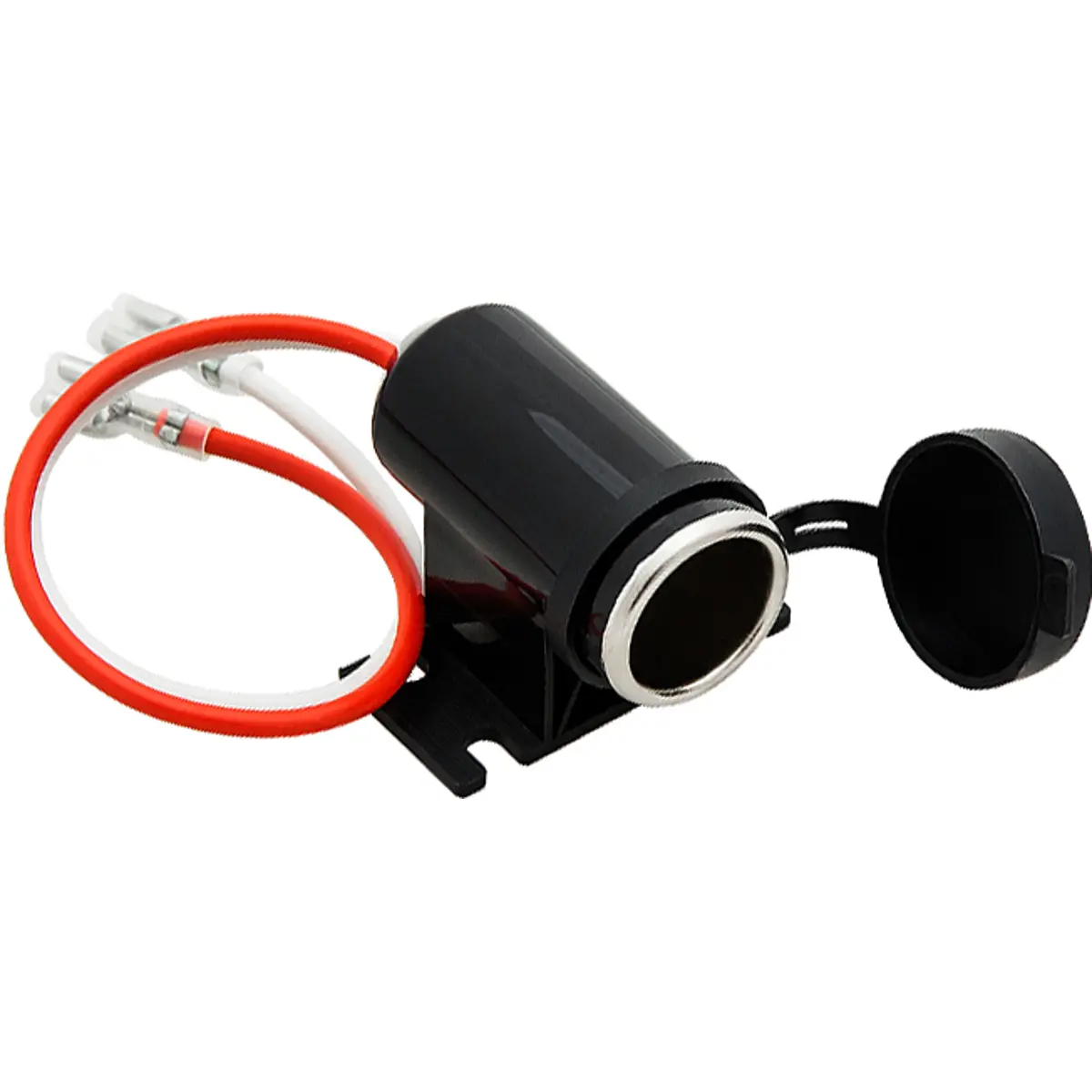 Tomada de isqueiro para automóvel com aba hermética e única entrada. Compatível com instalações de 12V e 24V, facilita a alimentação de dispositivos em veículos com estas voltagens, mantendo a proteção contra pó e humidade graças à aba hermética.