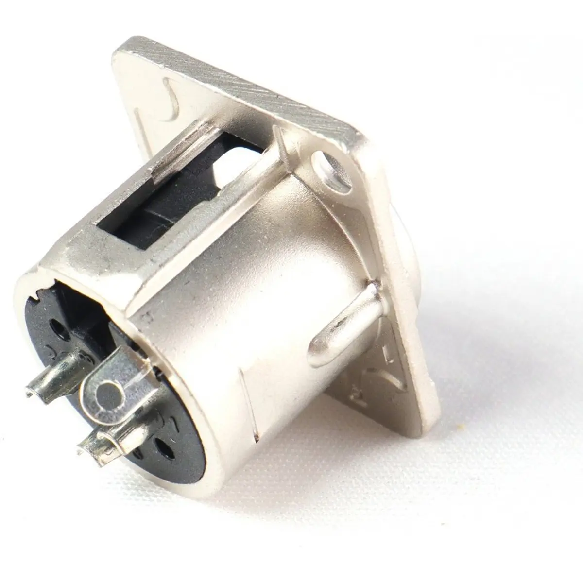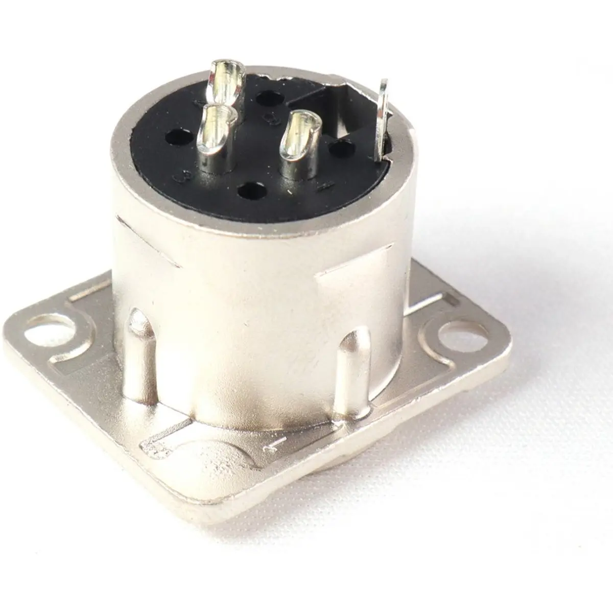 Conector XLR macho para montagem em painel com 3 pinos. Oferece resistência de isolamento superior a 1 GΩ, resistência de contacto até 5 mΩ e corrente nominal até 10 A. A vida útil supera 1000 ciclos de acoplamento, com força de inserção ≤20 N e força de retirada ≥20 N. O invólucro é zinco com banhado a níquel; a inserção é PA6+30%GF; os pinos são de latão e o contacto de terra é bronze; pinos e terra com estanho e cerâmica.