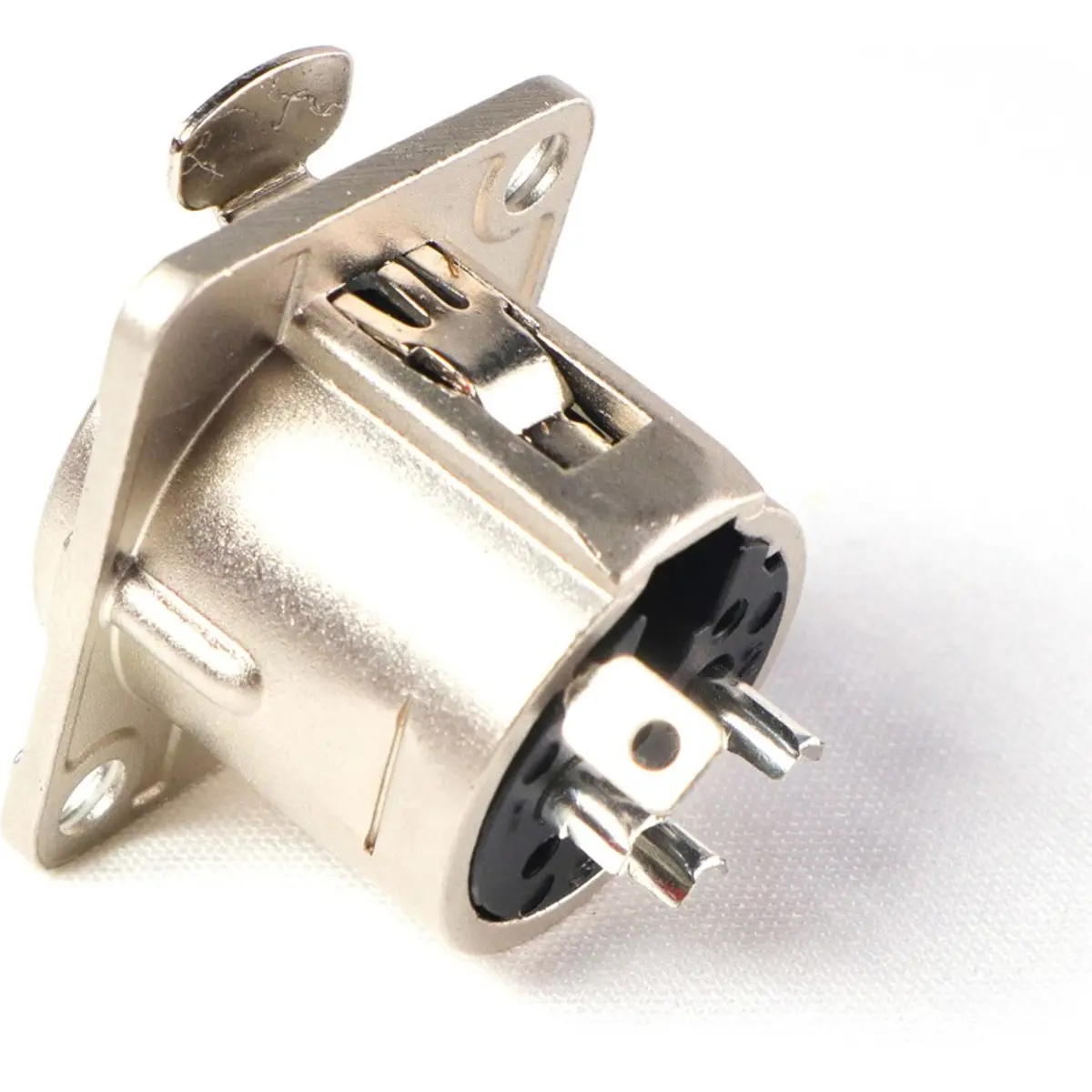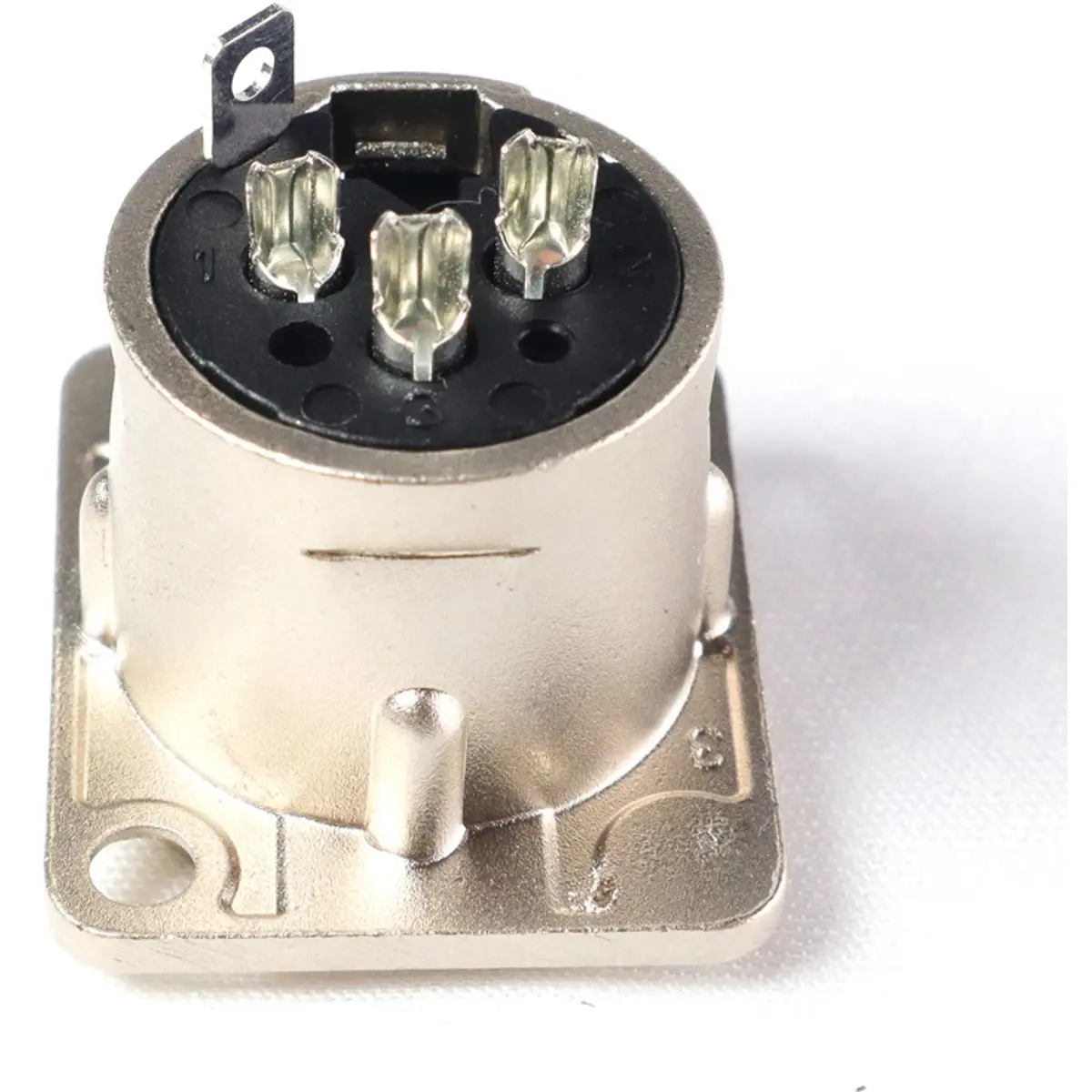 Conector XLR fêmea de painel com 3 pinos para montagem manual, resistente a altas tensões de isolamento (>1 GΩ) e baixa resistência de contacto (≤5 mΩ). Suporta corrente nominal até 10 A e oferece durabilidade superior a 1000 ciclos de acoplamento, com força de inserção e retirada ≤20 N. Ideal para aplicações de áudio e equipamento de palco, assegurando fiabilidade e encaixe seguro.