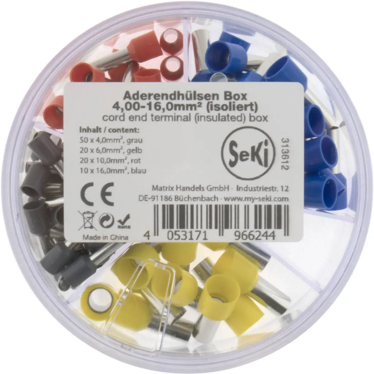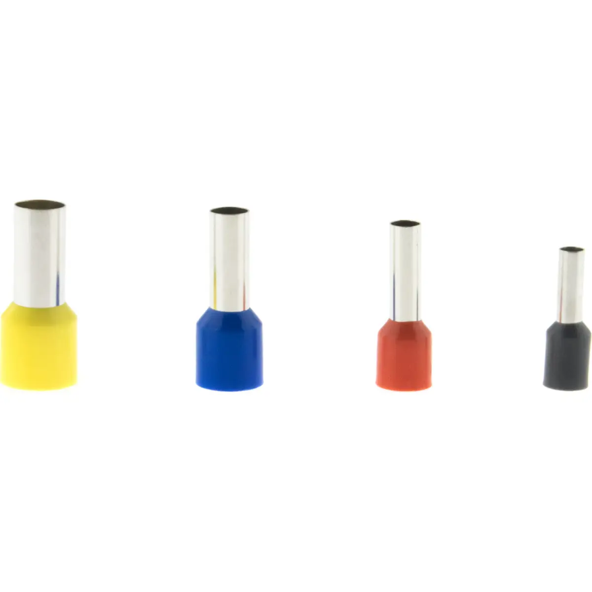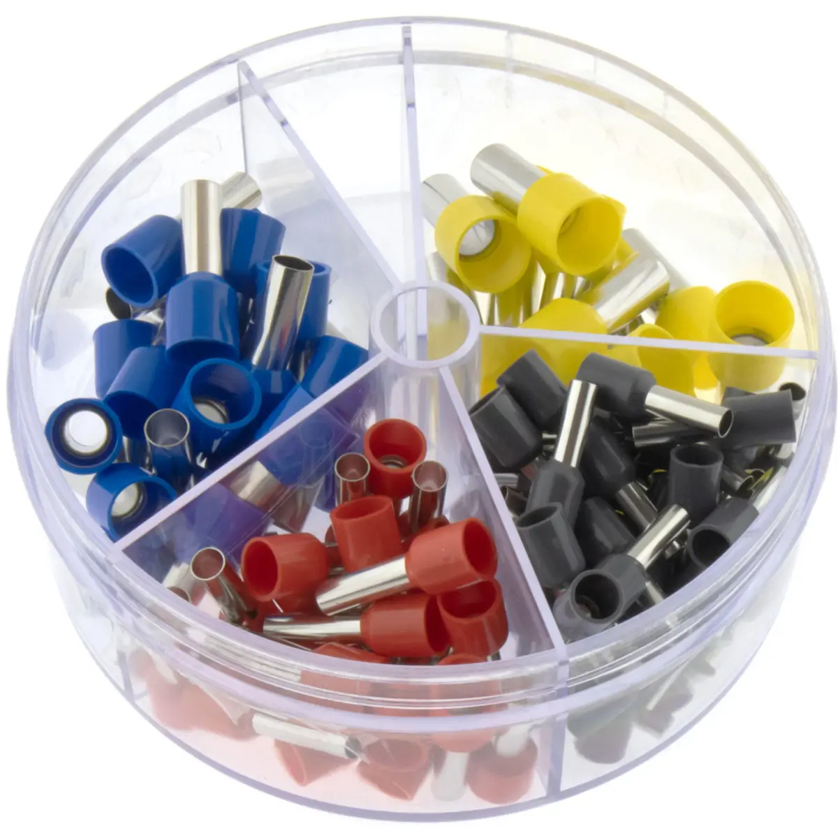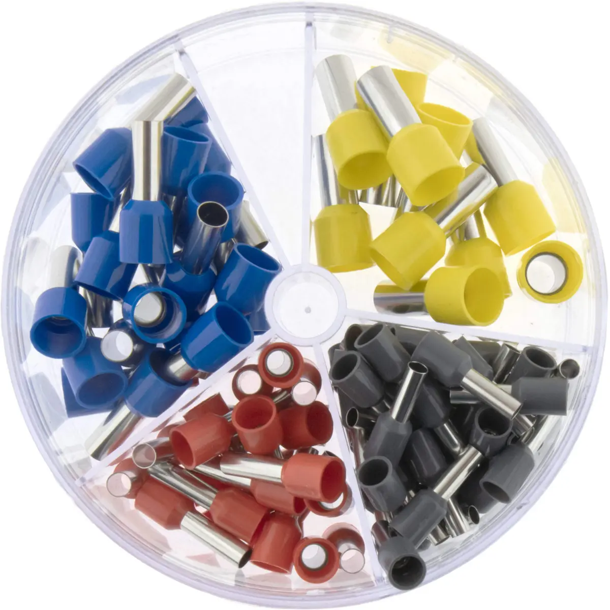 Conjunto de 100 ponteiras isoladas para condutores elétricos, com quatro secções de 4,0 mm², 6,0 mm², 10,0 mm² e 16,0 mm², distribuídas por 50x, 20x, 20x e 10x, totalizando 100 peças. Ideal para ligações elétricas rápidas e seguras.