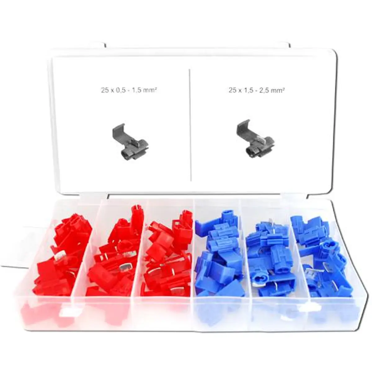 Conjunto de ligadores rápidos para ligações elétricas, permitindo ligar fios sem descarnar o isolamento. Compatível com fios de 0,5-1,5 mm² (vermelho) e 1,5-2,5 mm² (azul). Inclui 50 unidades em cores vermelhas e azuis, ideal para instalações elétricas domésticas e industriais. Proporciona ligações rápidas e seguras, mantendo o isolamento preservado e reduzindo tempos de montagem. Adequado para trabalhos de manutenção, reparação e montagem em quadros elétricos.