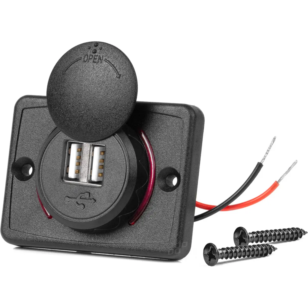 Carregador quadrado impermeável com duas portas USB-A QC3.0 oferece carregamento rápido em veículos com 12/24V. Ideal para carros, barcos e ambientes agressivos, combina design moderno com robustez, iluminação LED vermelha que indica o estado de carga e proteção contra água. Perfeito para manter smartphones, tablets e acessórios sempre carregados, com construção confiável para uso externo ou interno.
