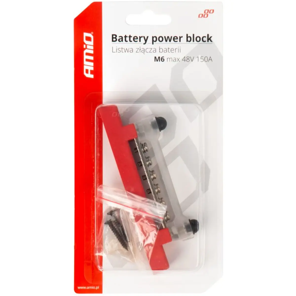 AMiO - Barramento de distribuição DC (BUS BAR) 6xM4 + 2xM6 - 12/48V 150A - Vermelho