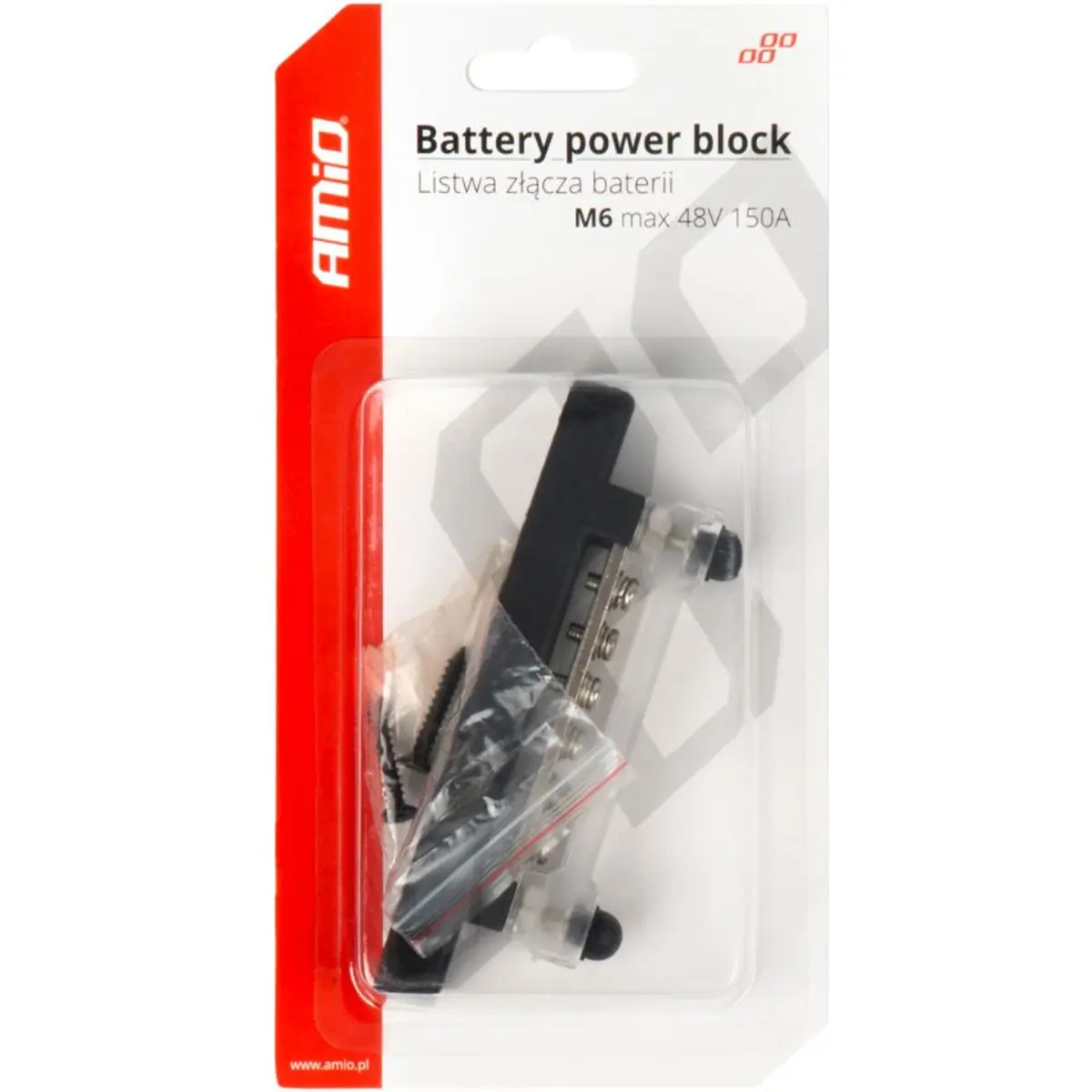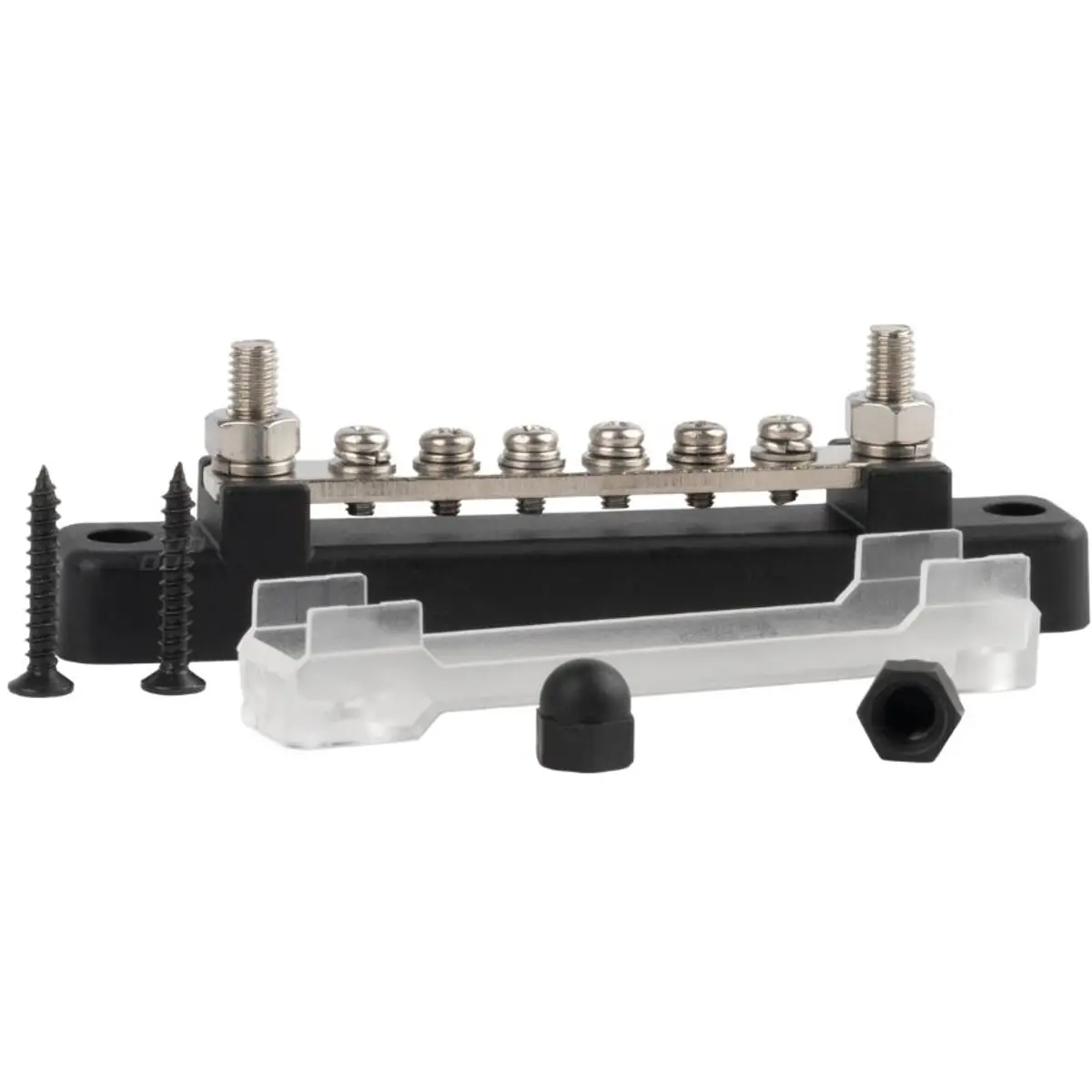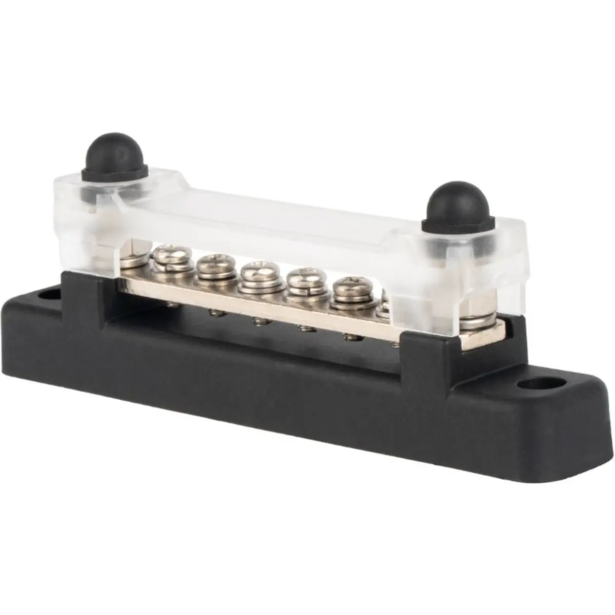 Bloco de distribuição de massa com 6 parafusos M4 + 2 parafusos M6 nas extremidades, projetado para aplicações profissionais em sistemas elétricos. Compatível com tensões de 12V a 48V e correntes até 150A, é um componente essencial para instalações automotivas, marítimas e de energia.