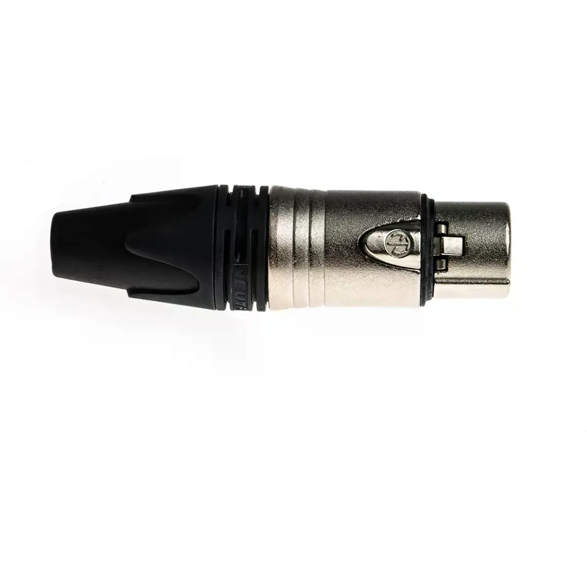 Este conector de cabo XLR fêmea de 4 polos, modelo NC4FXX, oferece fiabilidade para áudio profissional e electrónica. Com invólucro em liga de zinco e contactos com revestimento prata sobre Ni, inclui barreira de solda, alívio de tensão tipo mandril, trinco metálico e botas de poliuretano para reduzir tensões por flexão. Disponível com anéis e botas coloridas para identificação. Design ergonómico, durável e de baixa resistência, opera entre -30 °C e +80 °C, em conformidade com IEC 61076-2-103 e classe IP40.