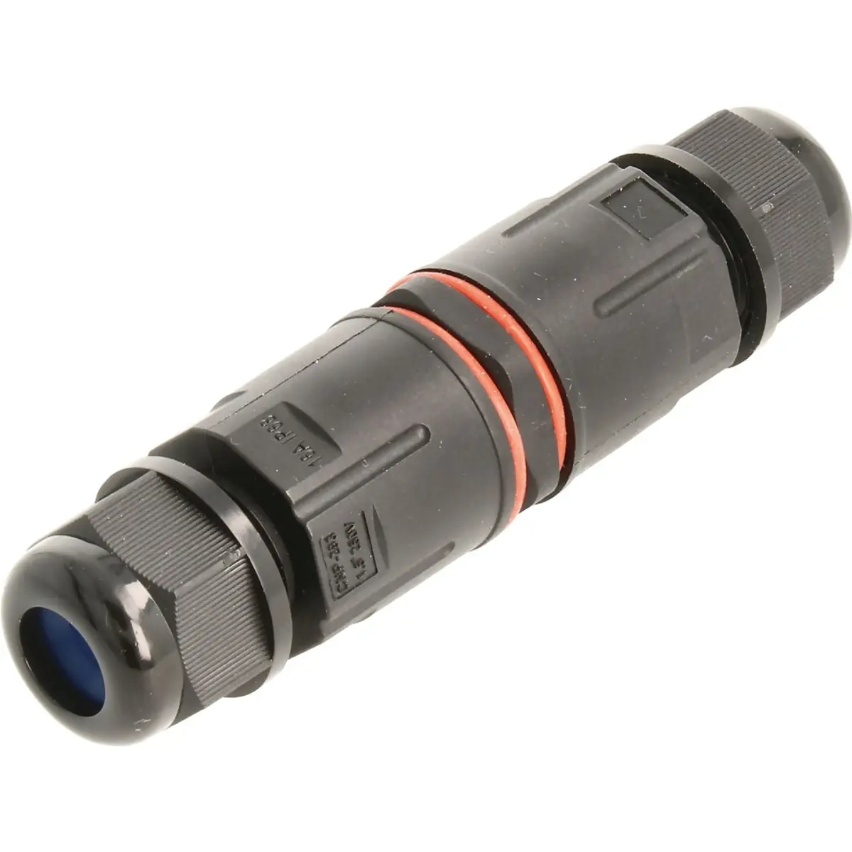 Ligador estanque de 3 vias com conectores rápidos, classificado IP68, destinado a ligações elétricas seguras em ambientes exteriores. Fabricado em poliamida 6, oferece invólucro retardador de chama (UL94 V1) e resistência aos raios ultravioleta. Suporta condutores de 0.5 a 1.5 mm², com 3 condutores por entrada/saída, operacional até 250V e 16A. Dimensões Ø30 x 102 mm, adequado para instalações compactas e protegidas contra água, poeira e impacto leve.