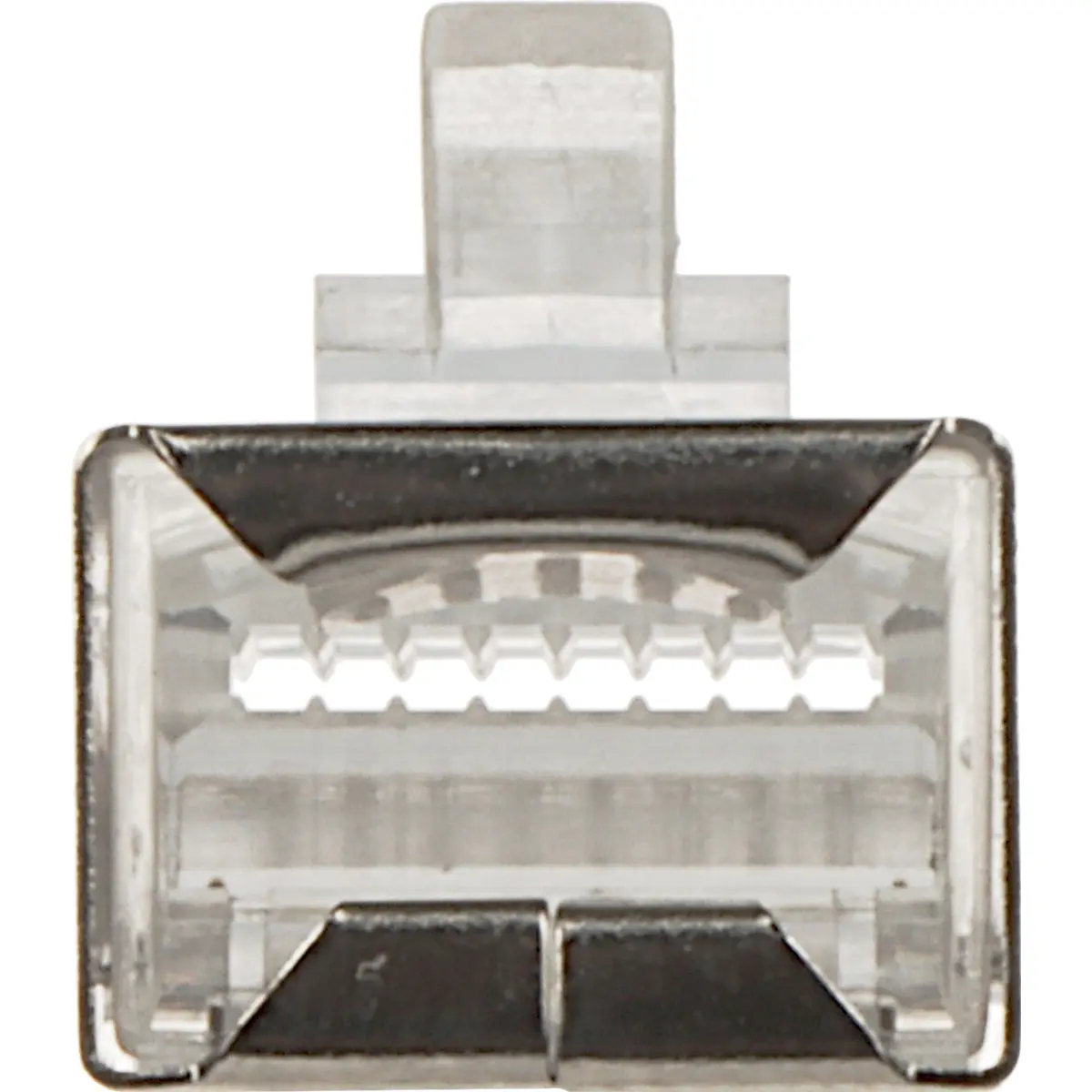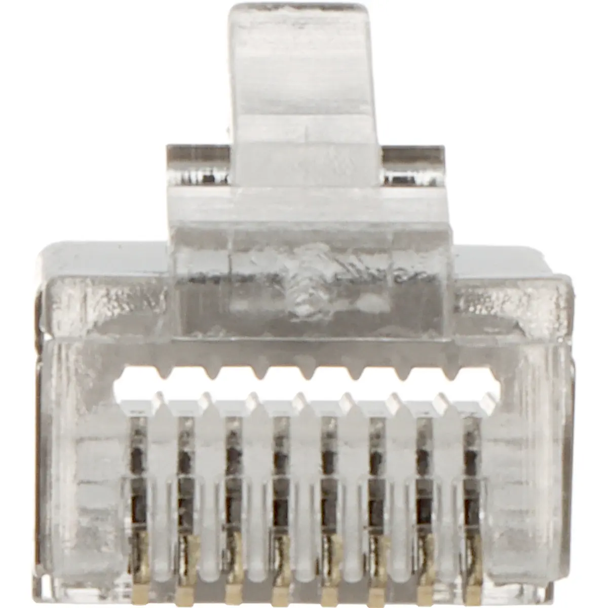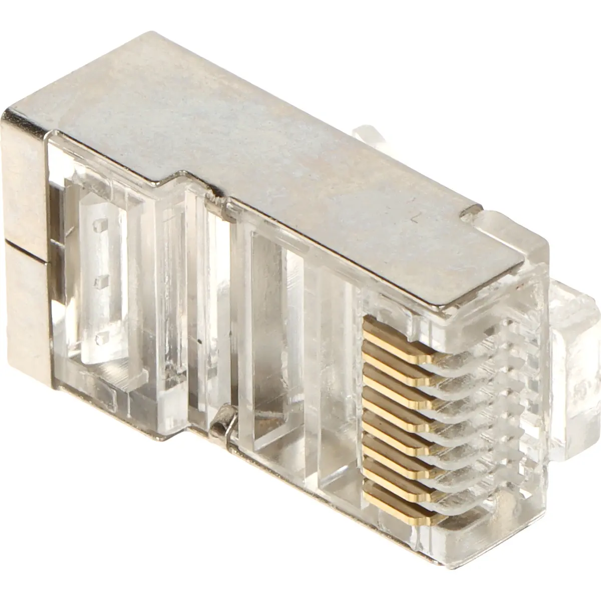 Conector RJ45 de tecnologia passante para cablagem de par trançado FTP Cat5e. Possui conector 8P8C com 8 pinos e fixação por aperto, incluindo fixação dos fios com três dentes para terminação estável. Fabricada em PET, adequada a aplicações de rede Ethernet, oferece ligação fiável, resistência mecânica e compatibilidade com Cat5e e FTP. Ideal para montagem em quadros de distribuição e infraestruturas de cabeamento, assegurando conectividade segura e duradoura.