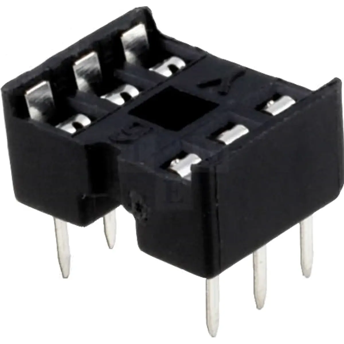 Suporte para circuitos integrados DIP com 6 pinos, largura de 7,62 mm e passo entre pinos de 2,54 mm. A montagem é THT (Through-Hole Technology), permitindo soldagem por furos em placas de circuito impresso. Ideal para ICs DIP, facilita a substituição de componentes e prototipagem em placas de circuito impresso com furação padrão.