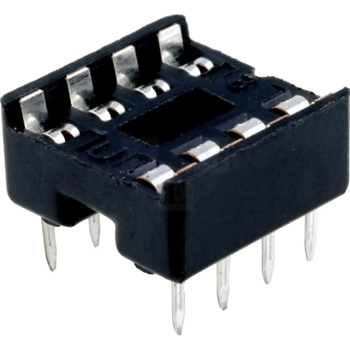Suporte para circuitos integrados DIP de 8 pinos com largura de 7.62mm e distância entre pinos de 2.54mm. Possui montagem THT (through-hole), ideal para prototipagem e substituição de sockets em PCB, oferecendo fixação estável e montagem simples em placas de circuito impresso.
