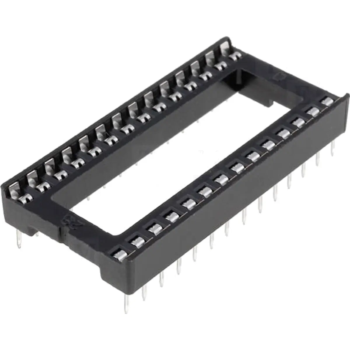 Suporte DIP para circuitos integrados com 28 pinos, largura de 15,24 mm e distância entre pinos de 2,54 mm, permitindo montagem robusta via THT. Ideal para prototipagem em PCB, oferece fixação estável e facilidade de substituição de ICs em placas, assegurando conectividade confiável. Compatível com uma variedade de circuitos integrados, proporciona durabilidade e precisão na montagem de ligações elétricas.