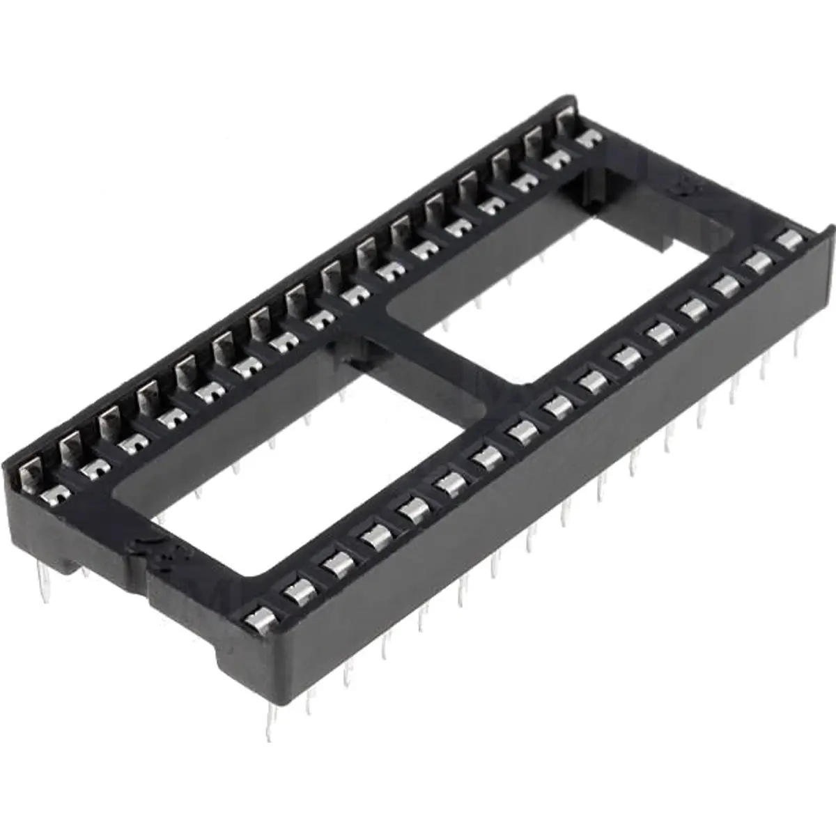 Suporte para circuito integrado DIP com 32 pinos, largura de 15.24 mm e distância entre pinos de 2.54 mm. Montagem por furos (THT) em placas de circuito impresso, oferecendo alojamento estável para ICs de 32 pinos e substituição simples. Ideal para prototipagem e ensaios, assegurando compatibilidade com componentes de 32 pinos e montagem durável.
