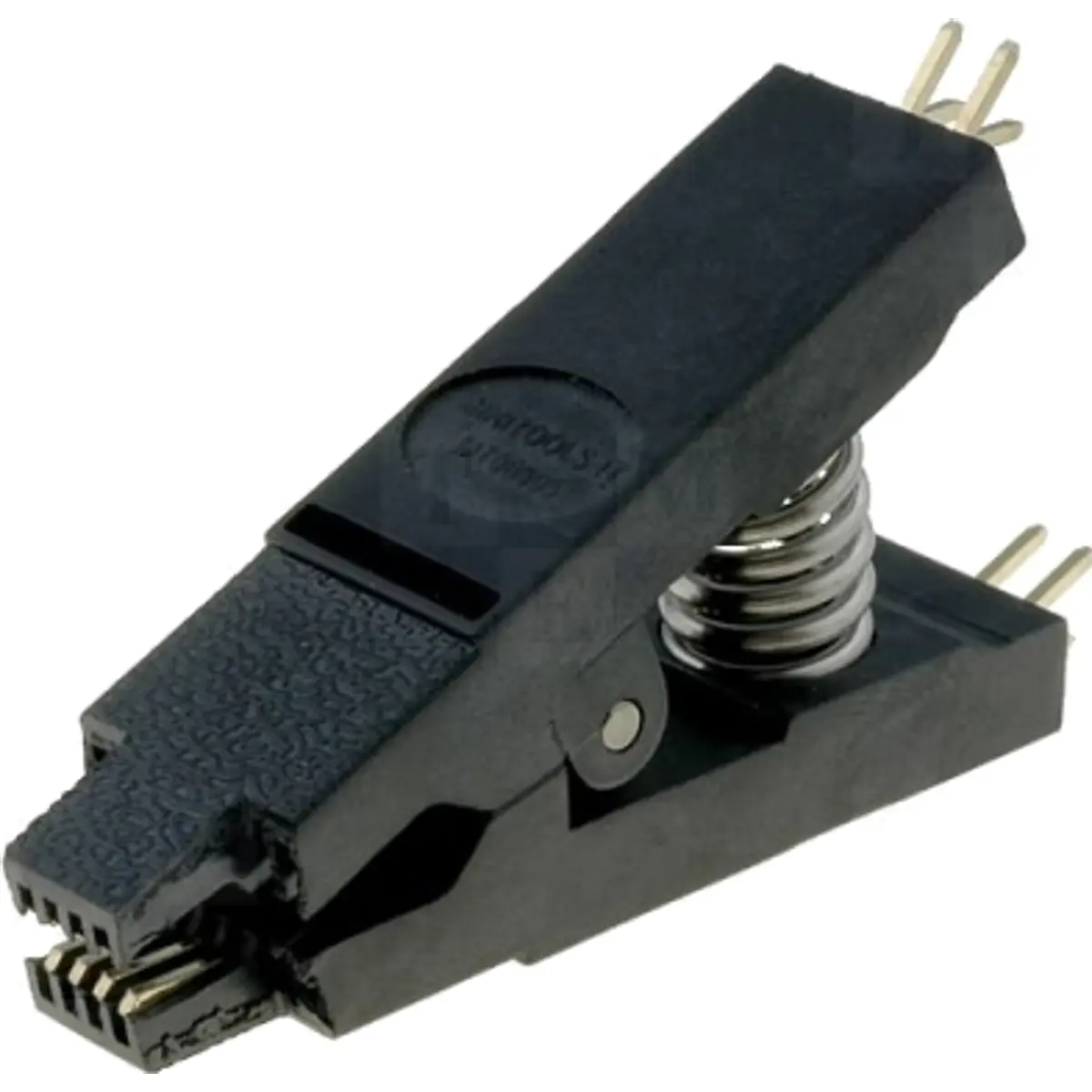 Clip de teste para integrados SMD SOIC8 de 8 pinos, com contactos dourados e corpo preto. Destinado a testes de semicondutores SOIC8, facilita a fixação e o contacto elétrico durante o ensaio de componentes, ideal para laboratórios e bancada de desenvolvimento para aferição de funcionalidade e continuidade de componentes SMD.