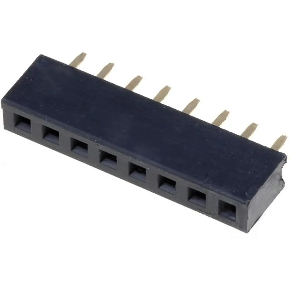 Conector de barra fêmea de 8 pinos para PCB com passo de 2 mm e montagem THT. Configuração 1x8, orientação direita e altura de 4,5 mm, oferecendo uma solução compacta para ligações elétricas estáveis entre componentes em protótipos e produção. Compatível com placas de circuito impresso que utilizam montagem por furos, facilita ligações resistentes e confiáveis, ideal para projetos eletrónicos sem referência a marca.
