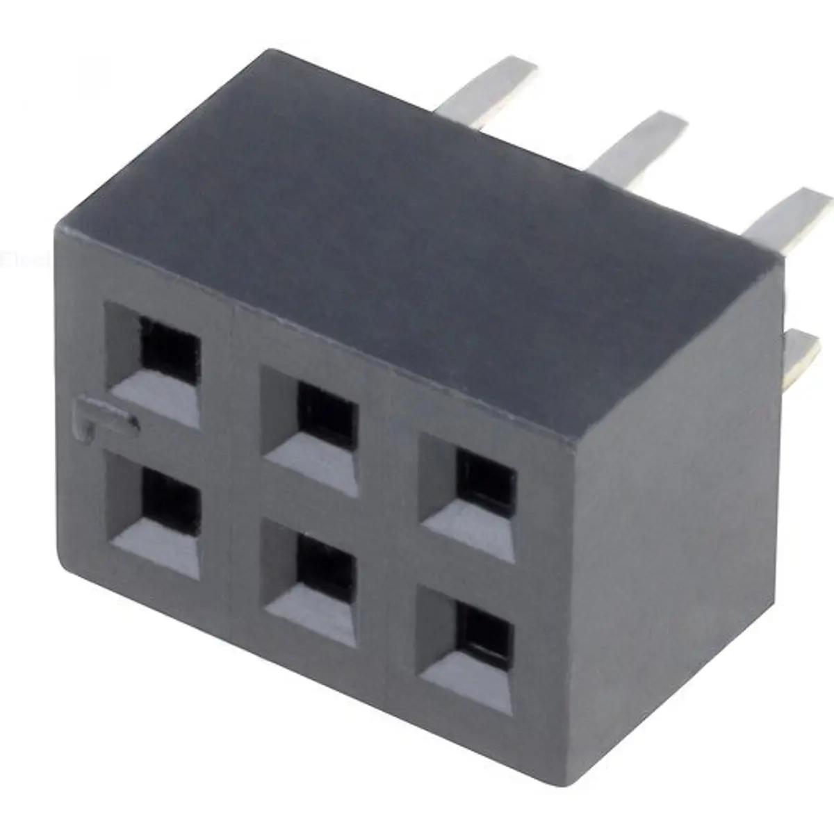 Conector fêmea para PCB com barra de 6 pinos (2x3), orientado para montagem THT. Possui distância entre pinos de 2 mm e altura de 4,5 mm, com configuração 2x3, o que facilita ligações seguras em placas de circuito impresso. Ideal para projetos que exigem encaixe estável, fiável e compatível com montagem THT, oferecendo robustez e fiabilidade em aplicações eletrónicas.