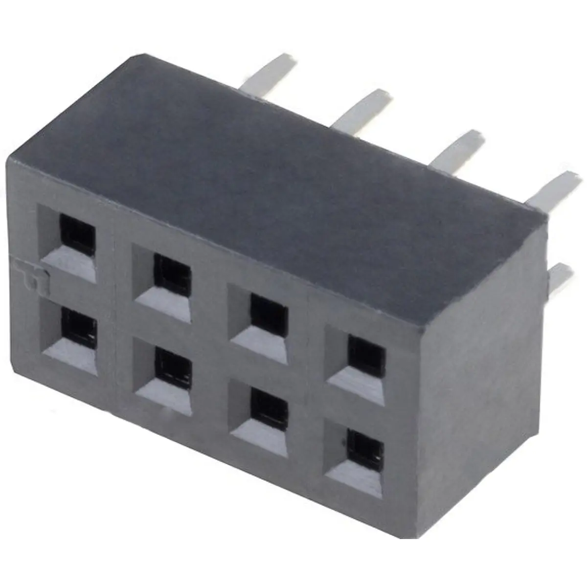 Conector de PCB fêmea com 8 pinos dispostos em 2x4, passo de 2 mm, montagem por THT e orientação direita. A altura é de 4,5 mm, facilitando a inserção em placas de circuito impresso. Ideal para ligações estáveis de alimentação e sinal, oferecendo fiabilidade em aplicações que exigem configuração 2x4 e montagem em furos.