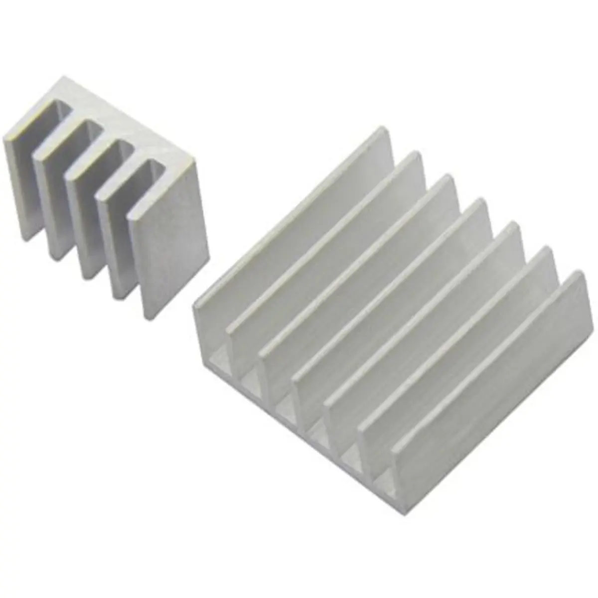 Kit de dissipadores de alumínio para Raspberry Pi, destinado à dissipação de calor dos chips. Inclui dissipadores de grande dimensão (14 x 14 x 6 mm) e pequeno (8,8 x 8,8 x 5 mm). Proporciona uma solução simples para a dissipação térmica da placa durante a operação, contribuindo para manter o desempenho estável.