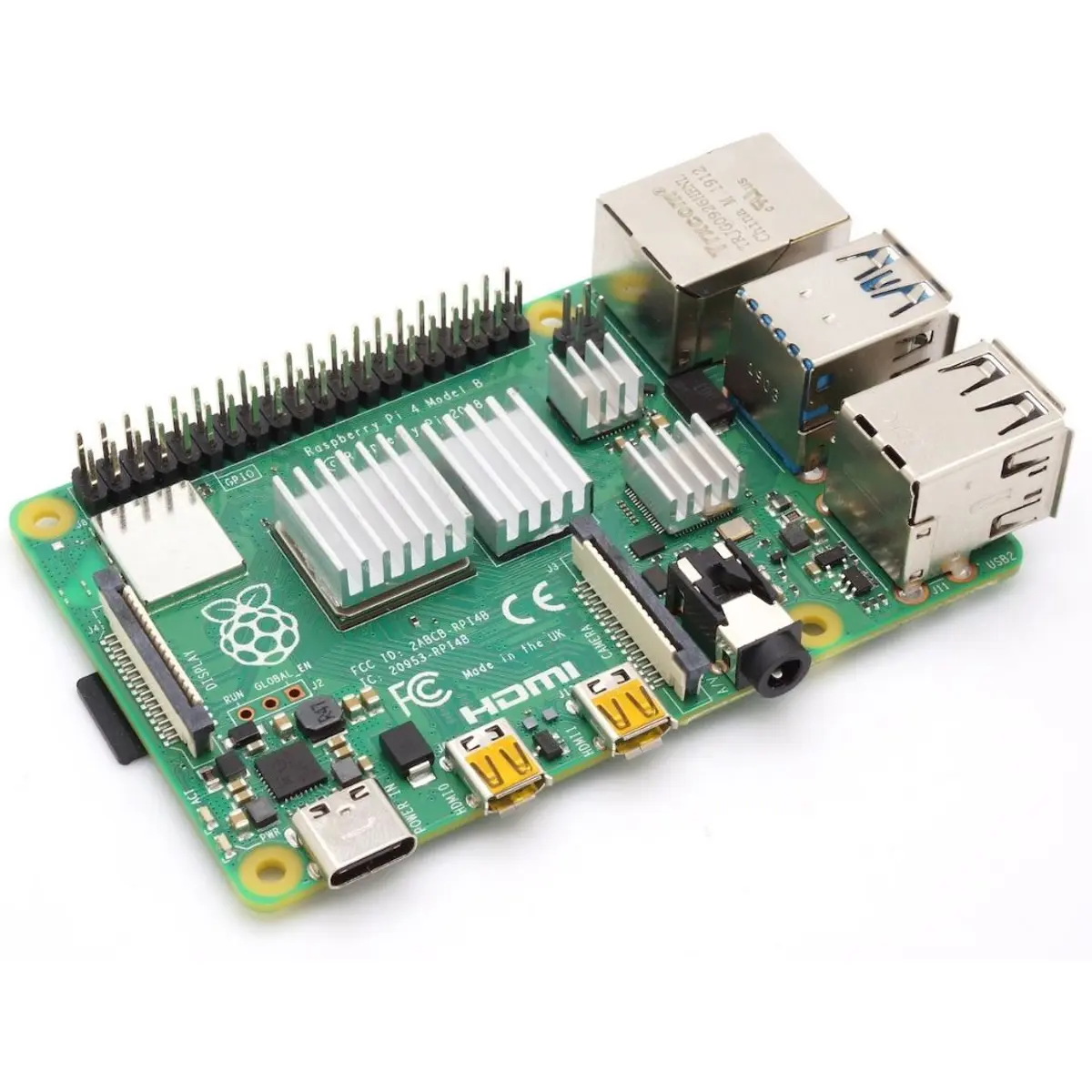 Kit de dissipadores de calor em alumínio, composto por 4 peças para o Raspberry Pi 4, que assegura dissipação eficiente do calor em tarefas exigentes. A fita adesiva termicamente condutora facilita a instalação; basta retirar a película protetora e colar. Inclui dissipadores para CPU (14x14x7 mm), RAM (10x15x5 mm), USB (8,8x8,8x5 mm) e Ethernet (6x6x5 mm). O design plano permite manter os HATs montados com os dissipadores, mantendo o conjunto compacto e prático.