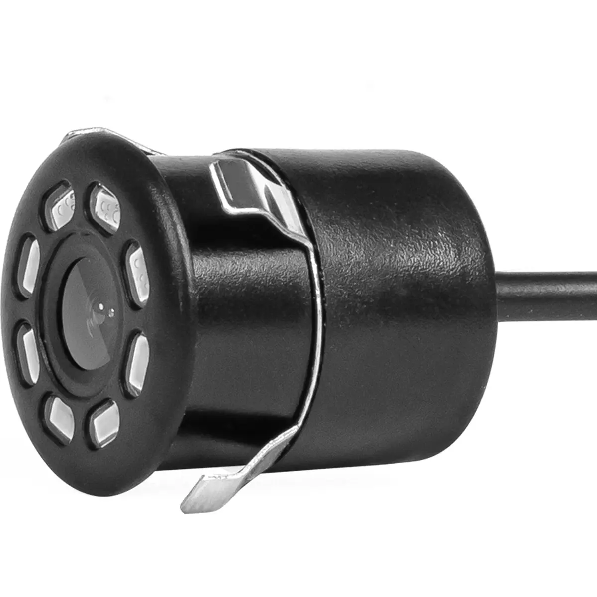 Esta câmara de estacionamento para automóvel oferece ângulo de visão de 140°, permitindo detetar obstáculos além dos espelhos e acionando-se automaticamente ao engatar a marcha-atrás, com linhas guia automáticas. Com sensor 1/4 CMOS, resolução de 628x586 px e 8 LEDs IR, assegura visão noturna nítida. A saída de vídeo CVBS PAL facilita integração em sistemas dedicados, foi concebida para funcionamento a 12 V DC e pode ser instalada na traseira ou dianteira do veículo. Inclui cabo AV de 6 m, cabo de alimentação de 1 m, broca e manual do utilizador.
