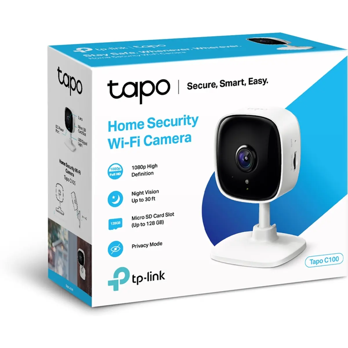 A Tapo C100 é uma câmara IP Wi-Fi concebida para vigilância interior, oferecendo captação de imagem em Full HD 1080p (1920×1080). Integra visão noturna por infravermelhos com alcance até aproximadamente 9 metros, assegurando vigilância contínua, mesmo em ambientes com pouca iluminação. O sistema de deteção de movimento permite identificar atividade no campo de visão, com envio de notificações em tempo real para dispositivos móveis. Dispõe de áudio bidirecional, com microfone e altifalante incorporados, para comunicação remota através da aplicação dedicada. Inclui ainda funcionalidade de alarme sonoro, que pode ser acionado para dissuasão.