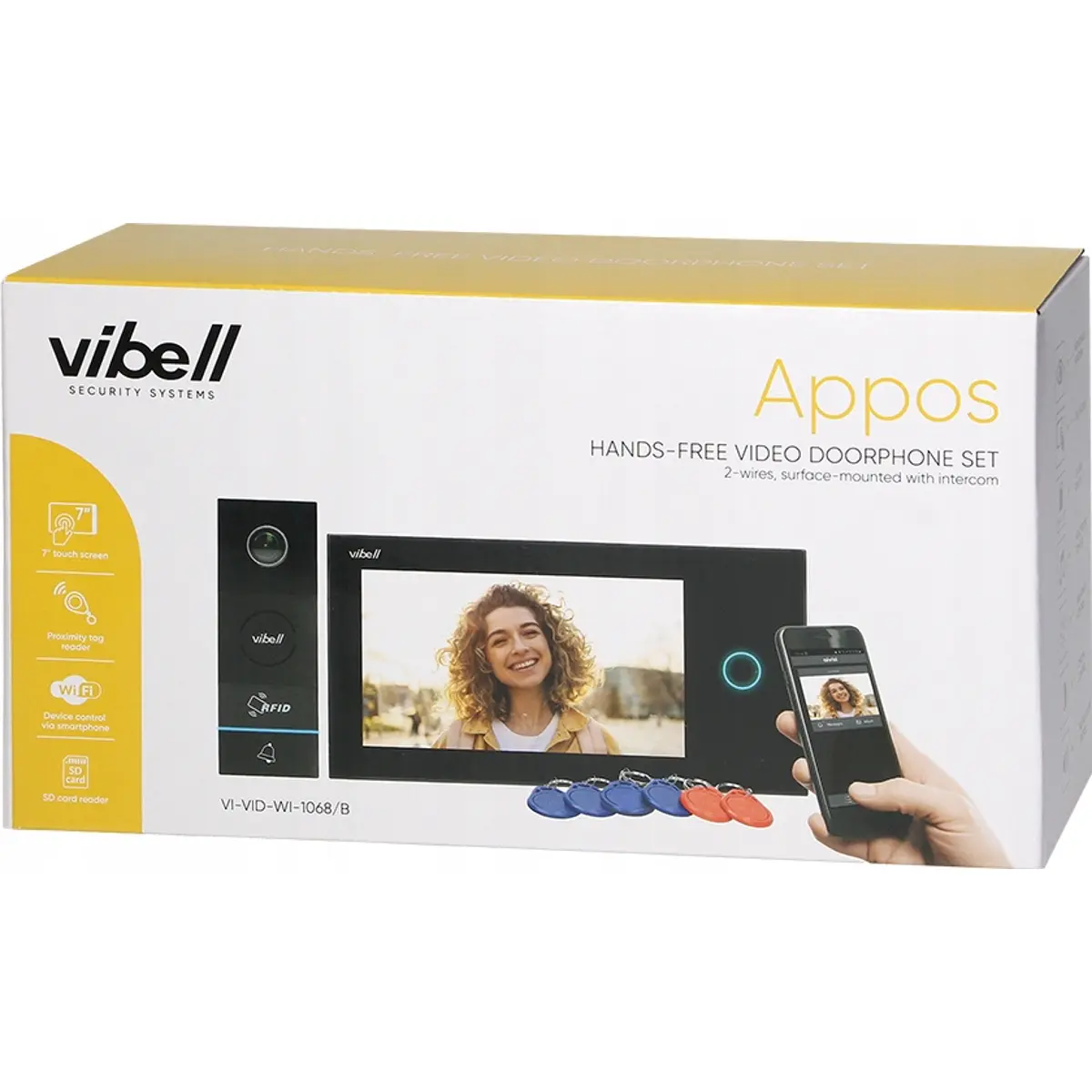 Um conjunto inovador de videoporteiro APPOS inclui um monitor LCD multicolorido de 7 "e uma câmara de vídeo grande angular externa. A comunicação entre os painéis interno e externo não requer nenhum monofone. Os utilizadores podem baixar um aplicativo gratuito para gerenciar o dispositivo diretamente de seus smartphones. Possui um leitor de cartões e TAGS de proximidade para login apenas de utilizadores autorizados. O conjunto pode gerenciar a abertura de portão e fechadura. Pode ser ampliado com unidades adicionais APPOS