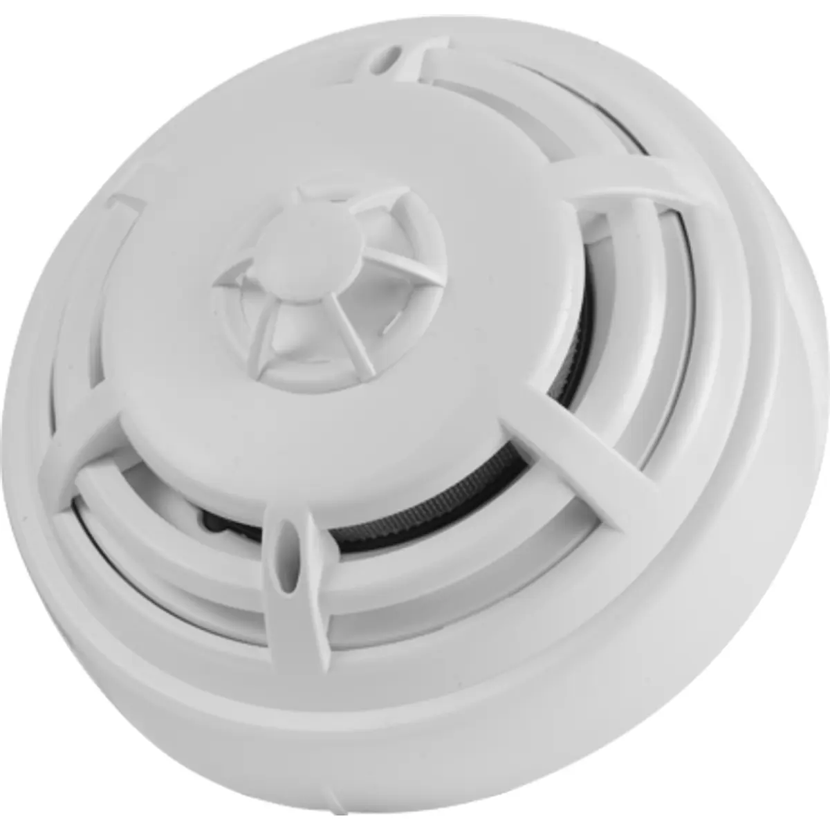 Detector convencional óptico-térmico de incêndio com certificação EN54, parte 5-7, e perfil baixo. Apresenta LEDs de alarme duplos para visualização a partir de qualquer posição, notificação de alarme e falha e corpo em ABS resistente ao calor. Permite bloquear o detector com a base para evitar remoção. Opera com 9–30 V DC, térmico de 57 °C, consumo em standby até 80 μA e 20 mA em alarme, iniciação máxima de 60 segundos e ciclo de intermitência de 16 segundos. Não inclui base.