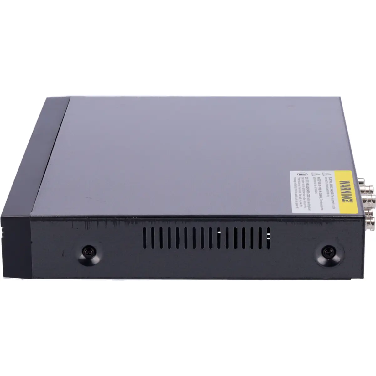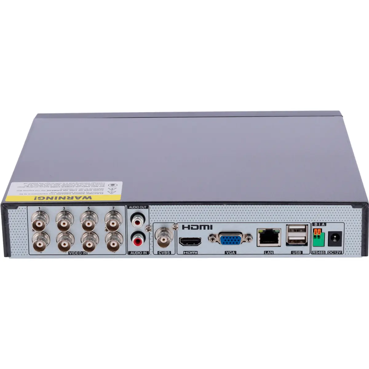 Gravador de vídeo híbrido 5-em-1 com 8 canais, suportando HDTVI, HDCVI, AHD, CVBS e IP. Codifica em H.265/H.264, oferece resolução até 5MPxLite a 10fps, áudio e saídas HDMI Full HD e VGA. A IA realiza detecção de pessoas e veículos em todos os canais, com classificação por intrusão de área ou transposição de linha. Permite armazenamento em HDD SATA de até 10TB, backup USB/rede e acesso remoto via navegador, app ou VMS, com visualização multicâmera e modo pentaplex.