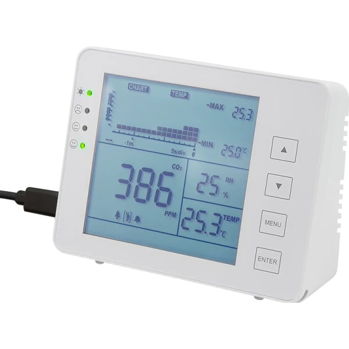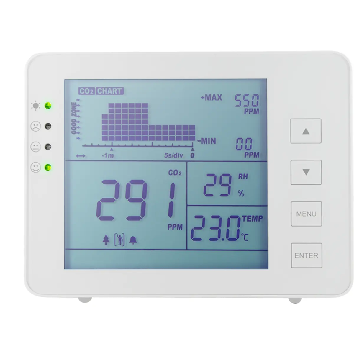 - Tela LCD super grande para monitorização simultânea de CO2 (faixa de 5000 ppm), temperatura e humidade.