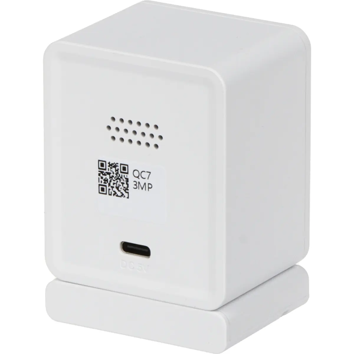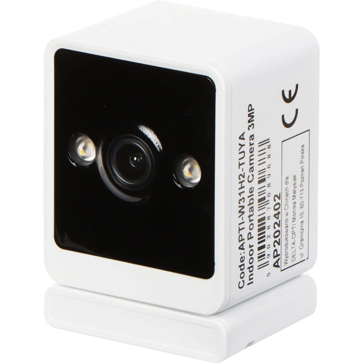 Camera de vigilância IP compacta com resolução de 3MP (2048x1536) e lente de 3.6 mm para um campo de visão de 70°. Compatível com Tuya Smart, oferece controlo remoto via aplicação móvel para Android e iOS, sem interface WEB. A ligação é via Wi-Fi (IEEE 802.11 b/g/n) com alcance até 30 m. Suporta MicroSD de até 128 GB, iluminação dupla com IR e LED branco, áudio bidirecional, vídeo com compressão Smart H.264, detecção de movimento e notificações Video PUSH. Alimentação 5 VDC, consumo ≤ 2 W.