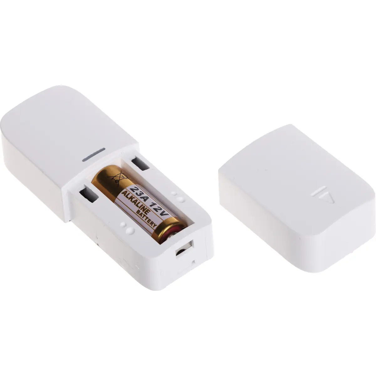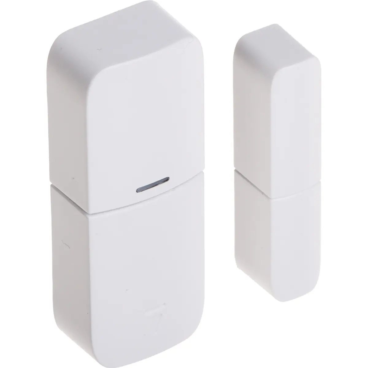 Sensor magnético sem fios para portas e janelas, compatível com centrais de alarme ATLO-AZ-WG13A-TUYA. O detector de abertura utiliza um contacto de lâminas (reed) e opera em 433 MHz, oferecendo alcance de rádio até 70 m. Alimentado por bateria de 12 V (tipo A23), consome até 10 µA em modo de espera e até 45 mA em sinalização de alarme. Inclui criptografia de dados Code 1527, funciona entre -10 °C e 50 °C e apresenta dimensões compactas com o íman e o contacto.